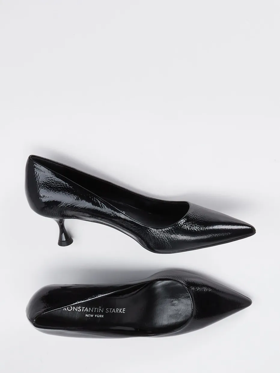 Die Pumps von Konstantin Starke brillieren mit glänzendem Lackleder und einer femininen, spitz zulaufenden Silhouette auf komfortablem Kitten Heel. Minimalistisch und dennoch markant im Stil.