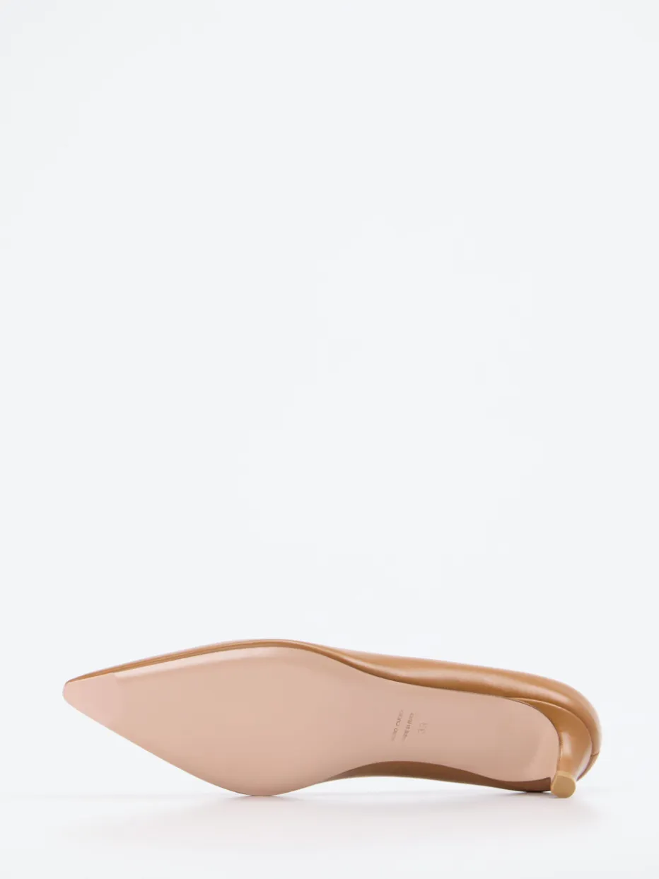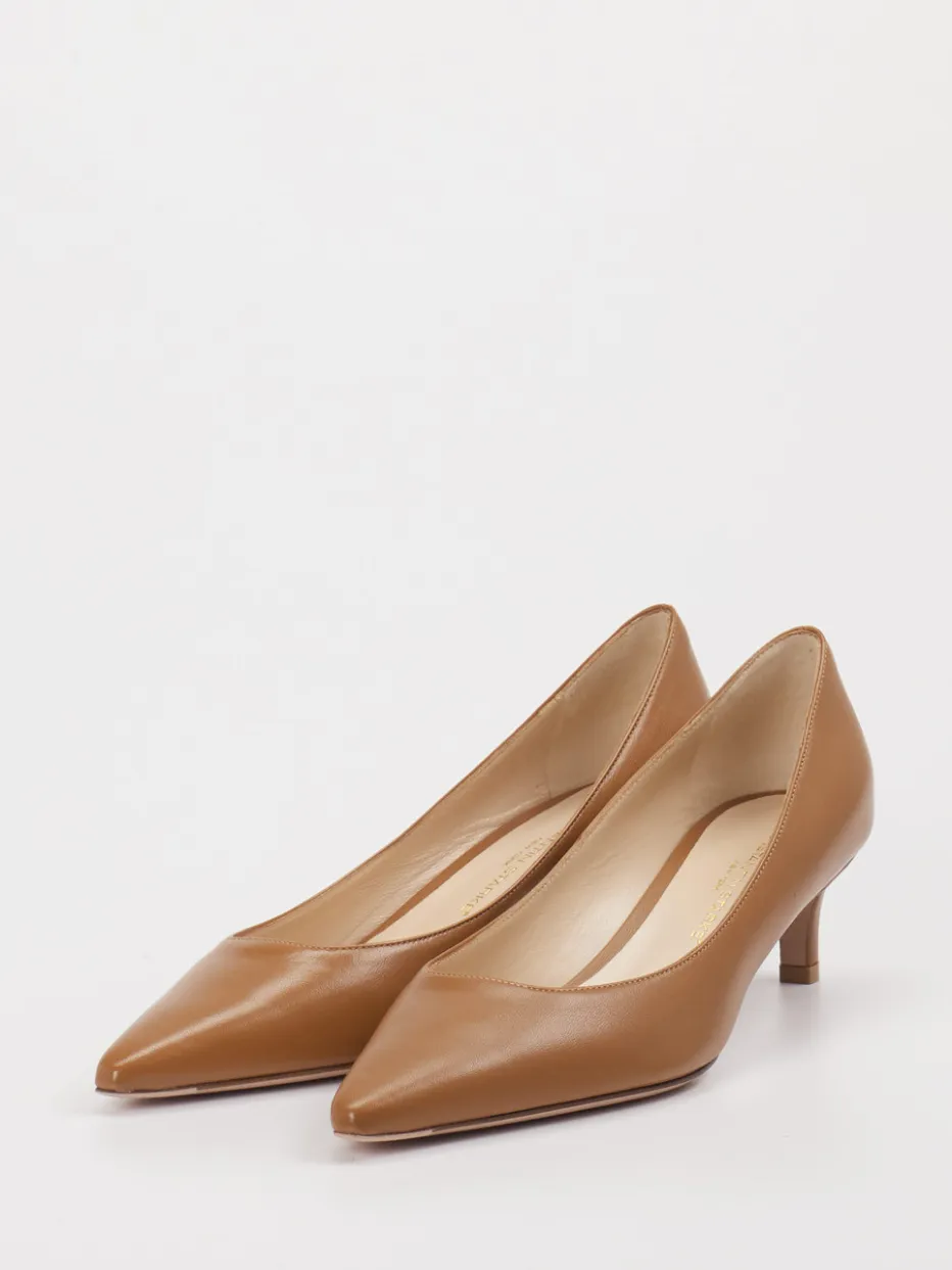 Diese Pumps aus hochwertigem, glänzendem Lammleder in Cognacbraun überzeugen durch eine spitz zulaufende Form und eine alltagserprobte Absatzhöhe von 4,5 cm. Der elegante Kitten Heel und das zurückhaltende, tonale Design unterstreichen den minimalistischen Charakter. Innen sorgt softes Ziegenleder in Nude für angenehmen Tragekomfort, während die Ledersohle besonders für Indoor-Anlässe geeignet ist. Perfekt abgestimmt auf Looks im Stil von „Quiet Luxury“ oder klassische Business-Outfits, lassen sie sich ideal mit cognacfarbenen Taschen und hellen Blazern kombinieren.
