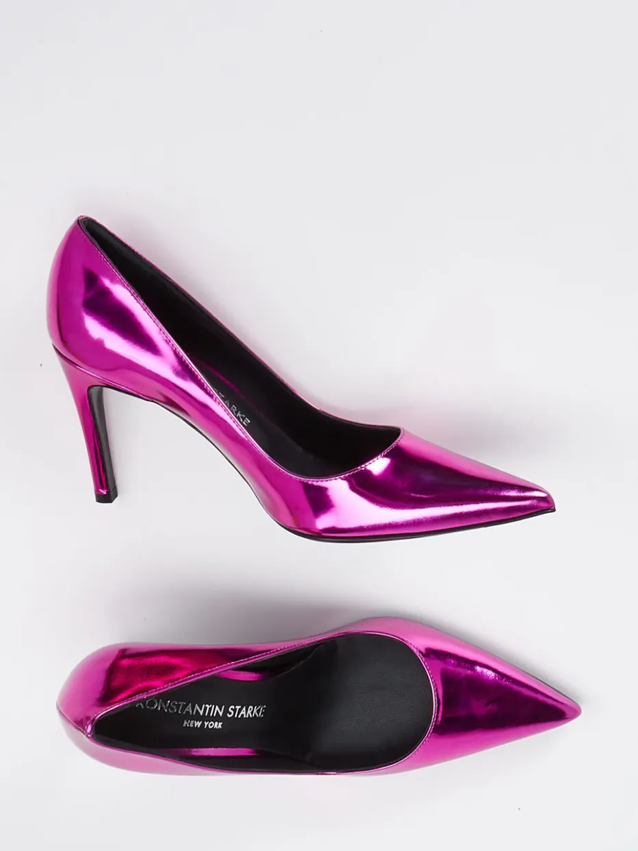 Glamour in jeder Bewegung.Die Marke Konstantin Starke präsentiert elegante Pumps aus Metallicleder. Ideal für besondere Anlässe, überzeugt dieses Modell mit glänzendem Fuchsia-Finish, spitzer Zehenform und einem feminin geformten 8 cm Pfennigabsatz. Die leicht gepolsterte Innensohle und das atmungsaktive Ziegenlederfutter sorgen für hohen Tragekomfort. Der gerade, schlanke Aufbau, kombiniert mit einer Lederlaufsohle und metallisch glänzendem Obermaterial, greift aktuelle Y2K- und Glam-Trends perfekt auf. In Kombination mit Metallic-Accessoires entsteht ein stilvoller Party-Look. Ein Fashion-Statement mit hochwertiger Verarbeitung und ästhetischem Anspruch.