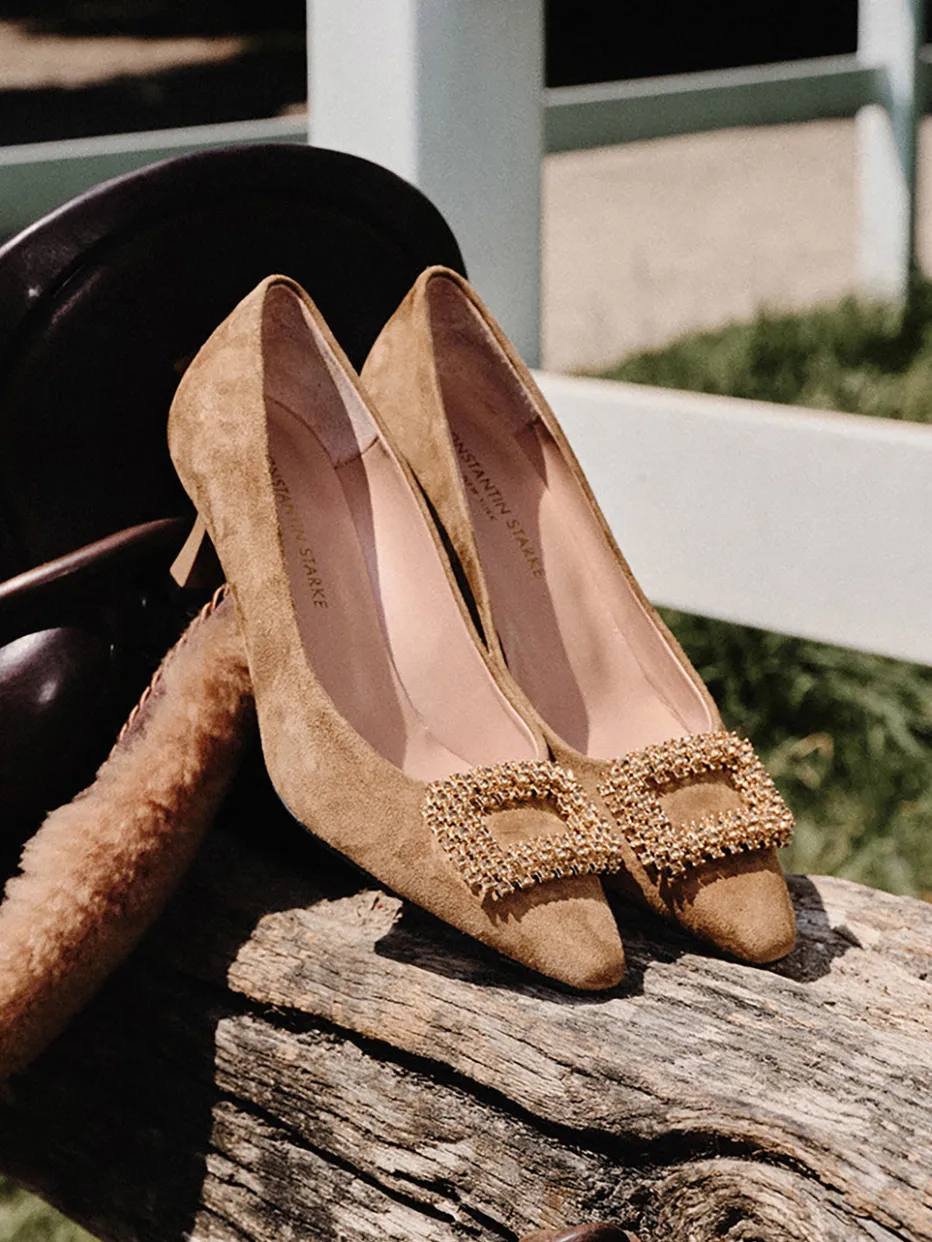 Konstantin Starke präsentiert einen eleganten Pumps für Damen mit klassisch spitz zulaufender Form und dekorativer Strass-Schnalle.