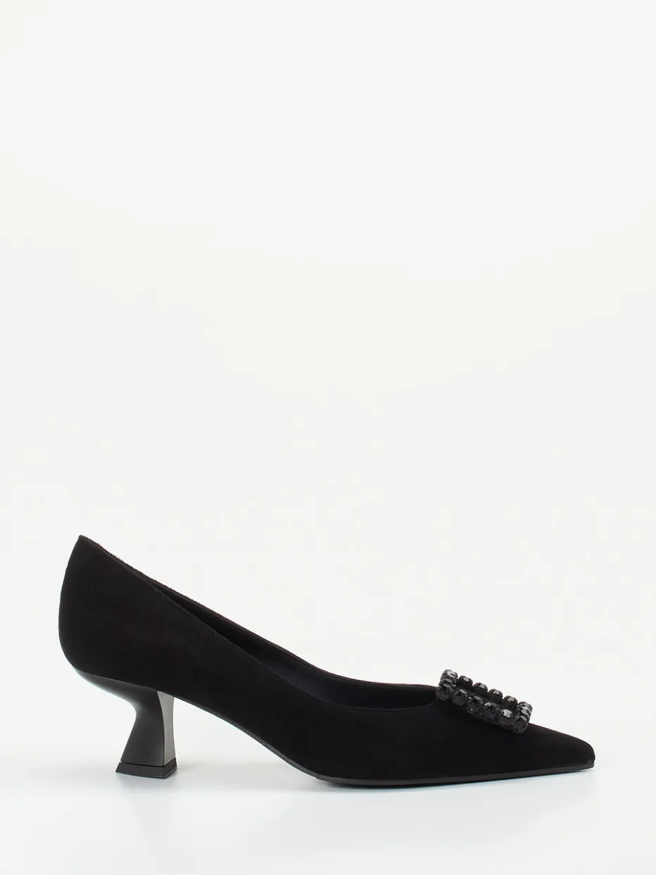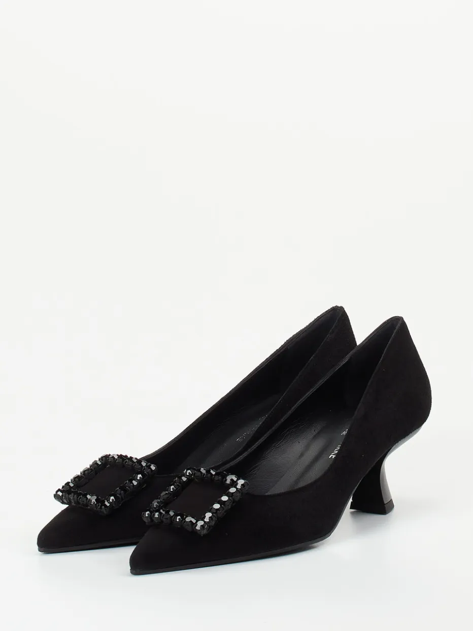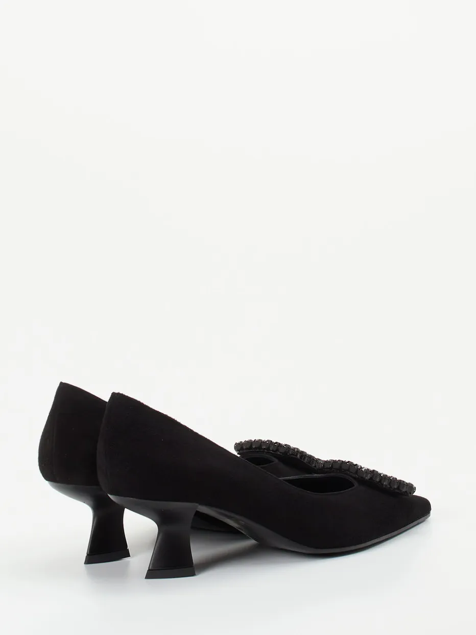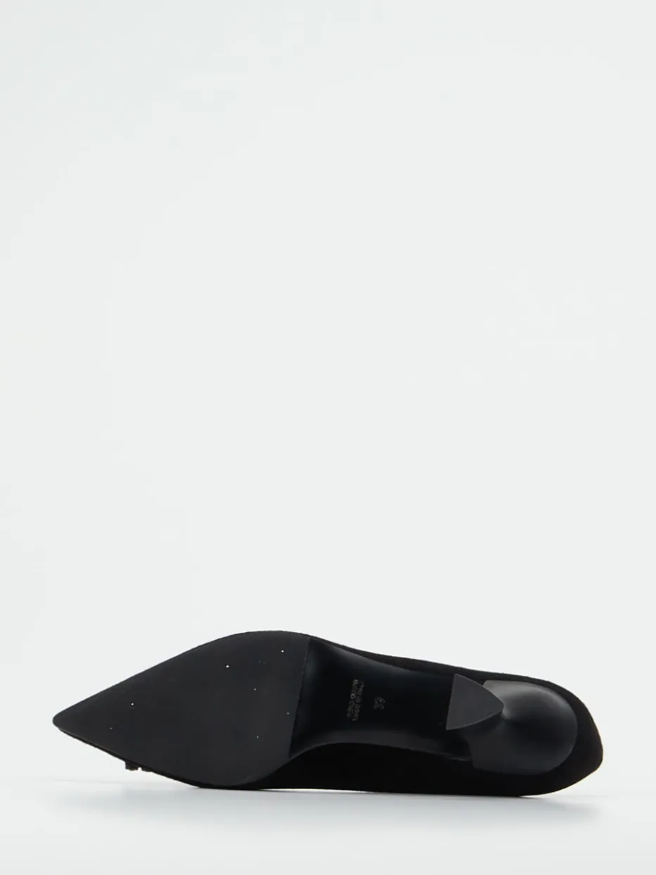 Filigraner Chic trifft auf luxuriöse Zurückhaltung: Diese Pumps von Konstantin Starke setzen mit edlem Veloursleder und glitzernder Agraffe stilvolle Akzente.