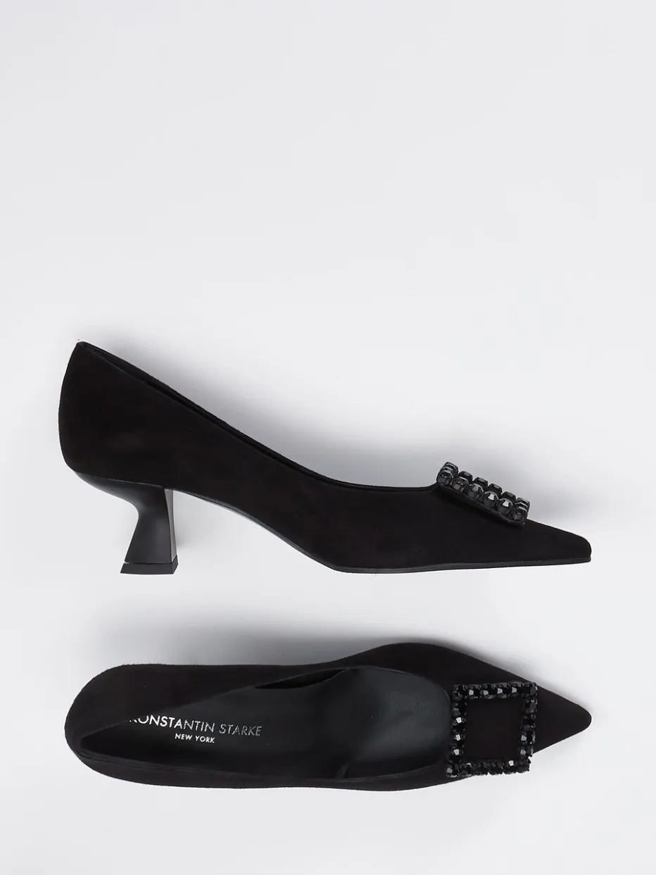 Stilvoll durch die Abendstunden.Die Marke Konstantin Starke präsentiert elegante Damenpumps in klassischer Kitten-Heel-Silhouette. Perfekt für formelle Events oder feine Abendanlässe unterstreicht das schwarze Veloursleder mit samtig-matter Textur den anspruchsvollen Charakter des Designs. Die spitz zulaufende Form schmeichelt dem Fuß, während die rechteckige Zierschnalle mit schwarzen Glitzersteinen subtilen Glamour ins Spiel bringt. Ein graziler Absatz hebt das Bein sanft an, ohne auf Komfort zu verzichten – dafür sorgen gepolstertes Kalblederfutter und eine flexible Gummieinlage in der Sohle. Ein Schuh, der Minimalismus mit dekorativer Raffinesse vereint. Zeitlose Eleganz mit exklusiver Detailarbeit – Konstantin Starke verkörpert stilsicher leisen Luxus.