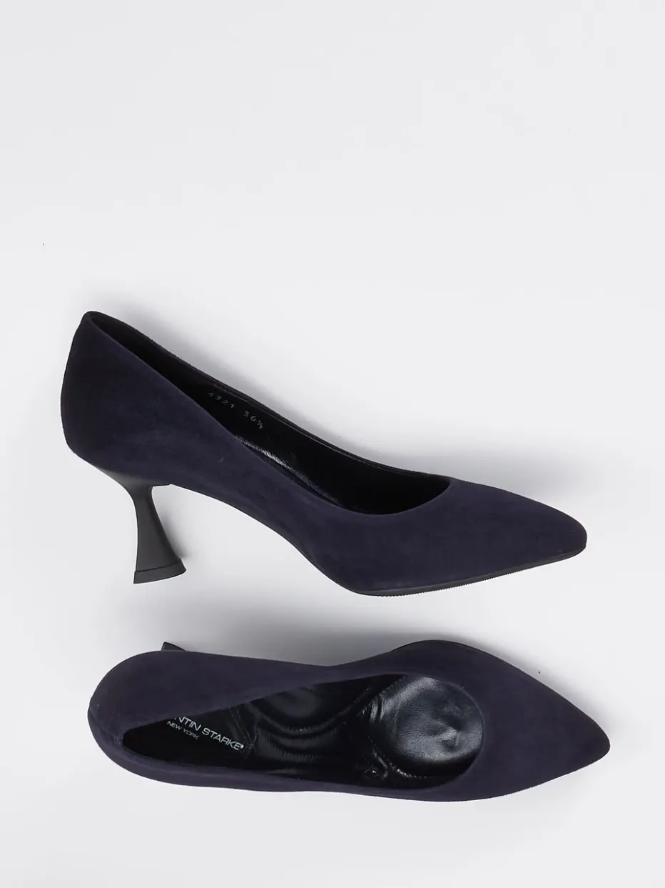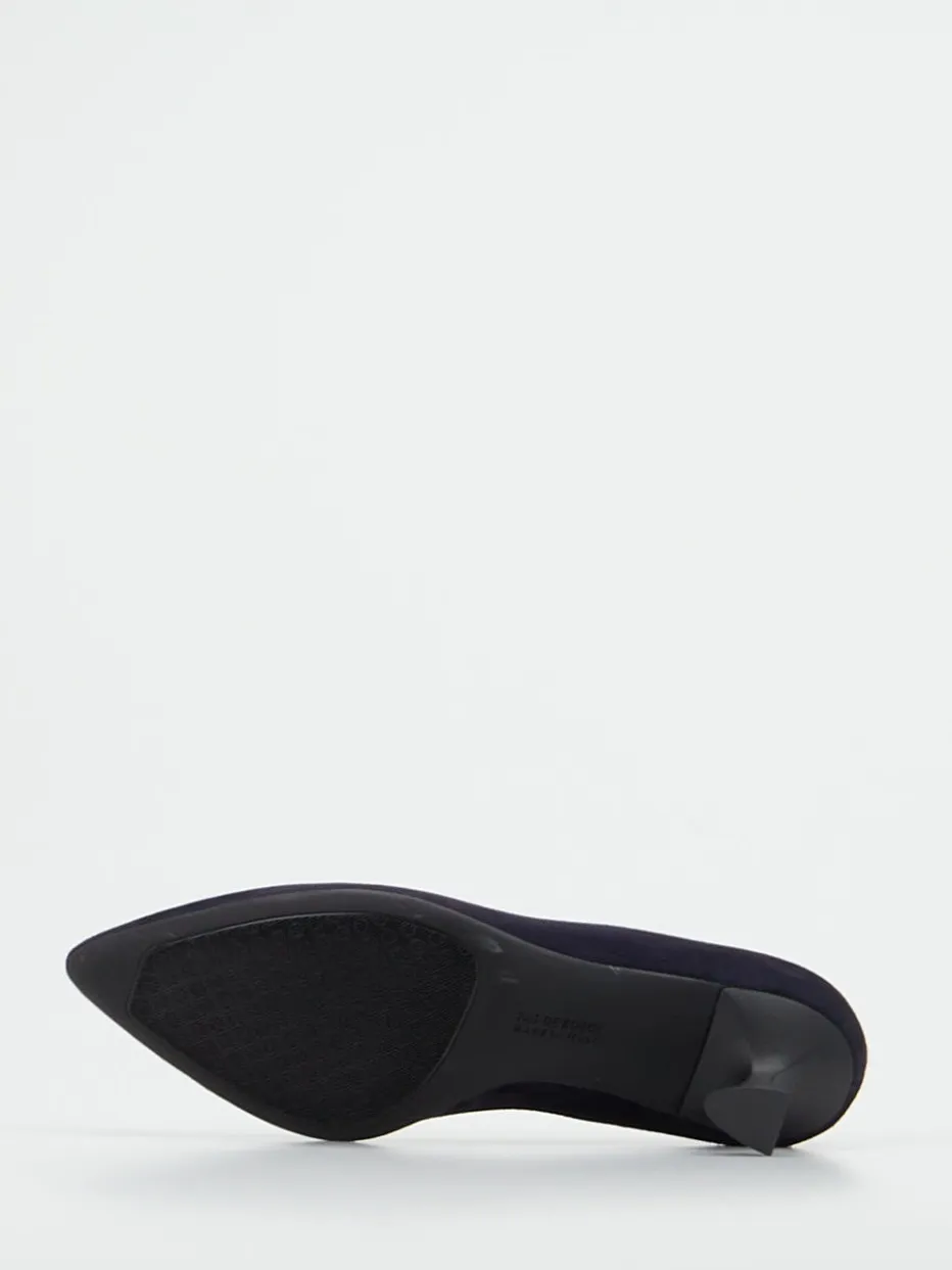 Ideal für formelle Anlässe oder anspruchsvolle Businesslooks: Das tiefdunkelblaue Veloursleder mit matter Oberfläche wirkt besonders edel auf dem spitz zugeschnittenen Leisten. Die klare Schlupfform harmoniert mit dem skulptural geformten Kitten Heel, der auf rund 7 cm Höhe einen eleganten Auftritt bietet. Eine weich gepolsterte Innensohle sorgt für angenehmen Tragekomfort. Ob zur Seidenbluse oder edlen Clutch – sie betonen einen zurückhaltend luxuriösen Stil.