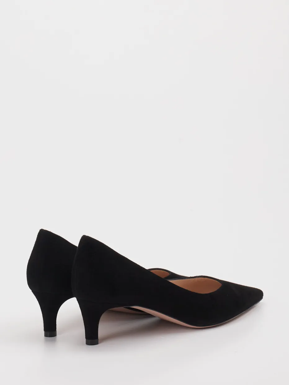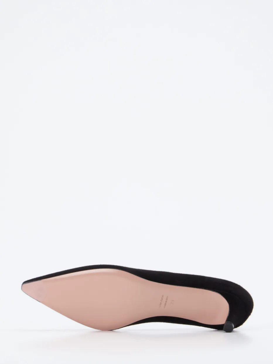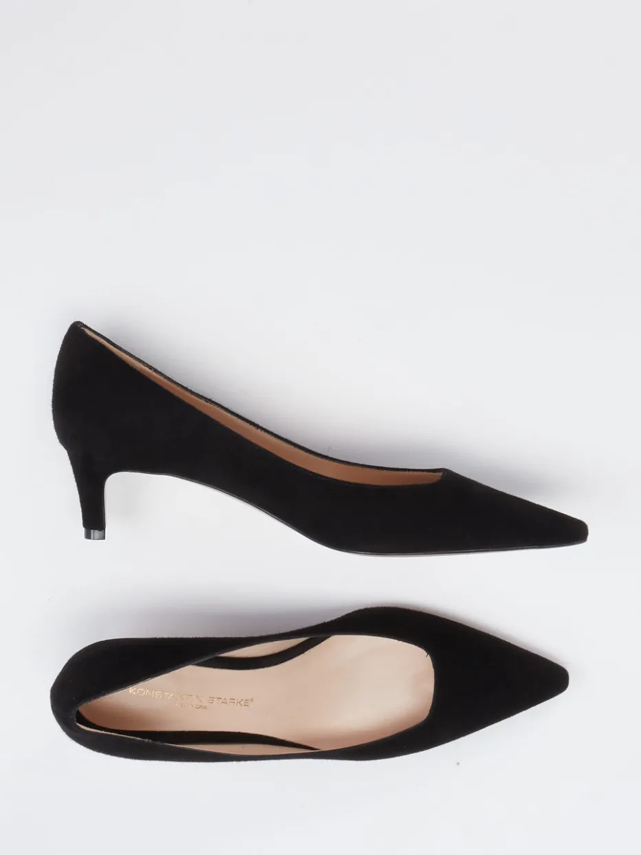 Stilvoller Auftritt mit Understatement. Konstantin Starke präsentiert elegante Damenpumps mit spitz zulaufender Form und Veloursleder-Obermaterial. Perfekt für Business-Meetings oder Abendveranstaltungen überzeugt dieses Modell durch sein mattes Finish, die tonige Nahtführung und den bequemen Kitten-Heel-Absatz mit 4,5 cm Höhe. Gefüttert mit Ziegenleder in Nude und mit Ledersohle versehen, bieten sie gehobenen Tragekomfort. Das tiefschwarze Erscheinungsbild fügt sich harmonisch in minimalistische wie klassische Outfits ein. Dezente Retro-Feminität trifft auf zeitlose Silhouette. Ein femininer Klassiker mit stilprägender Modernität aus dem Hause Konstantin Starke.