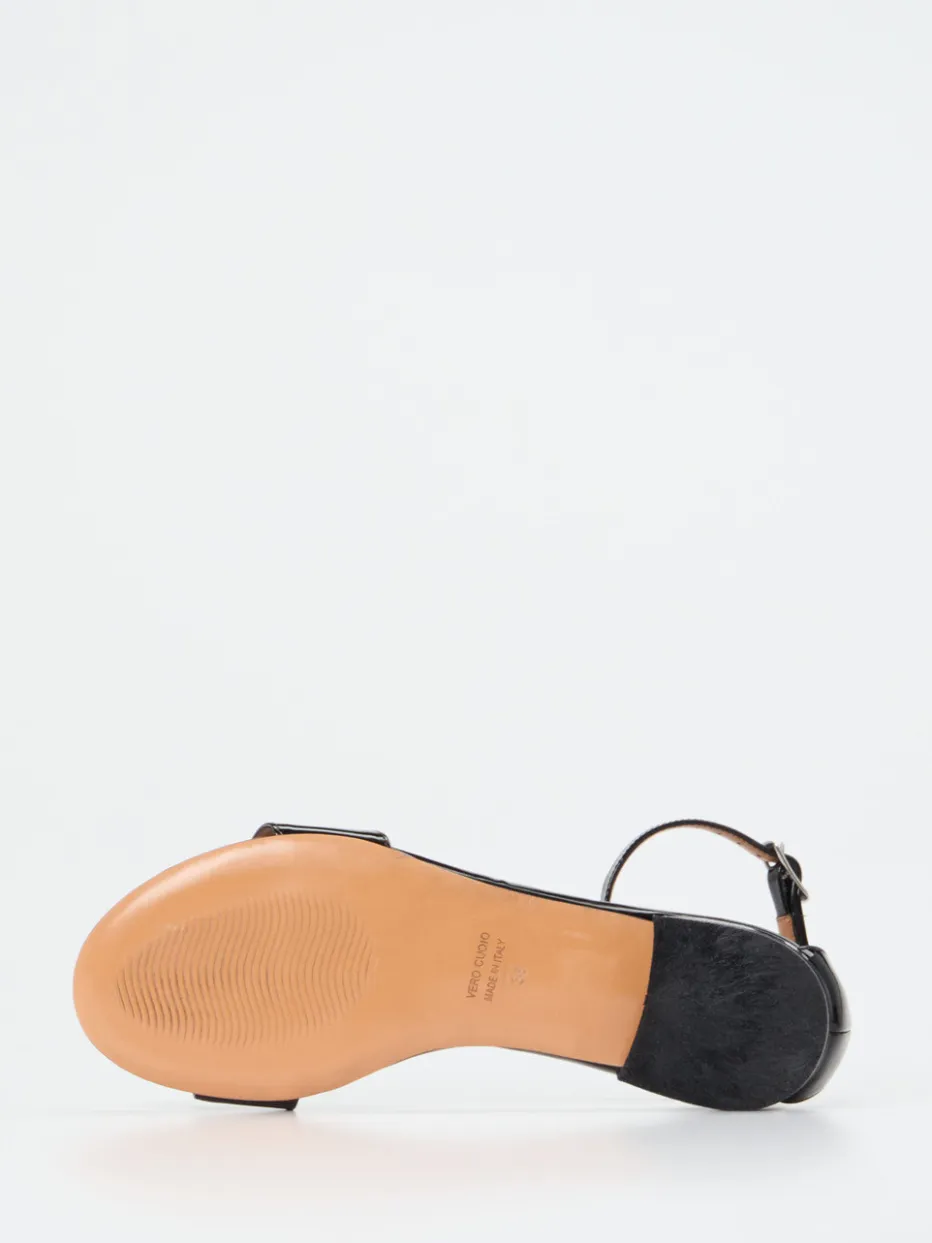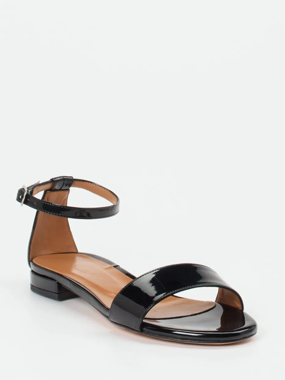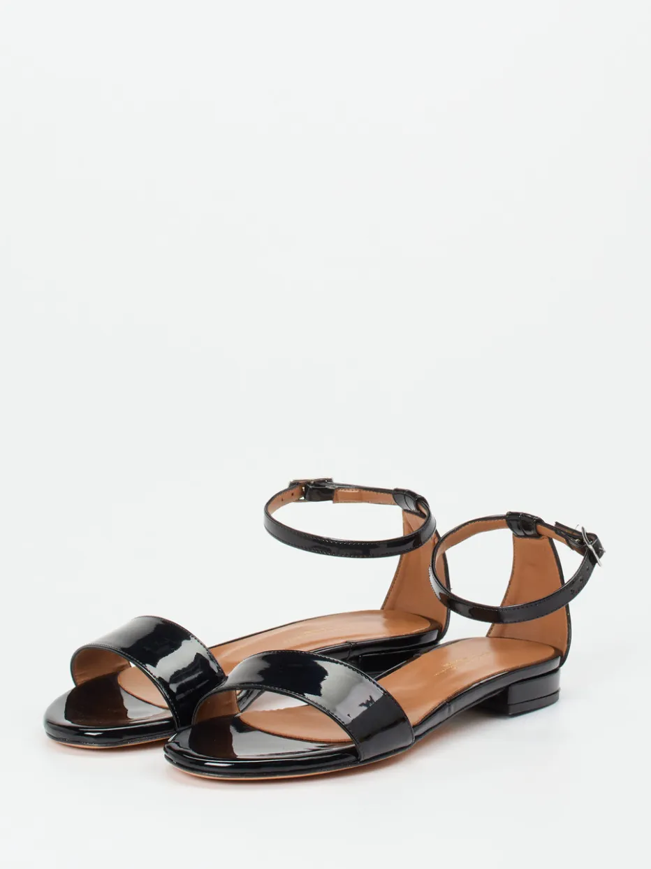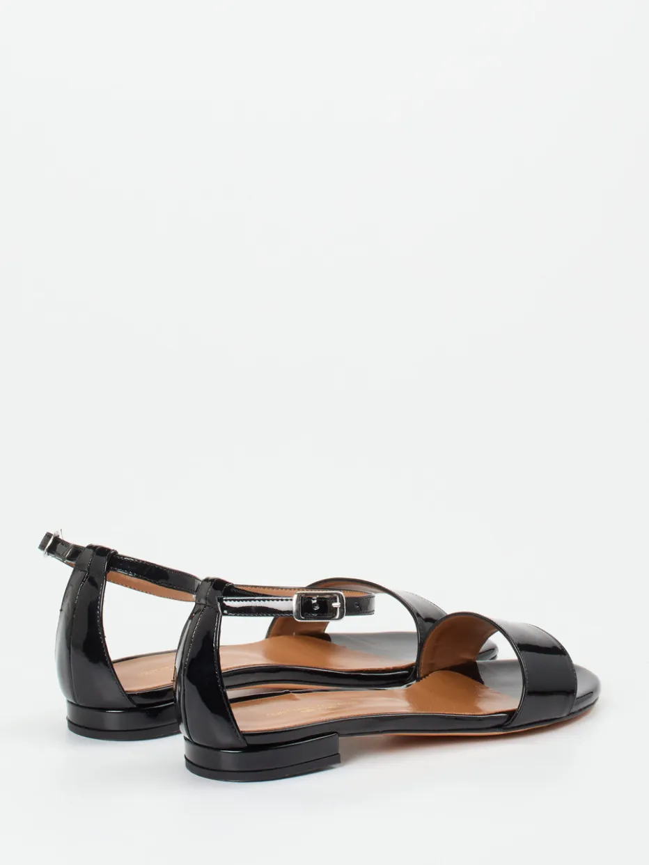 Die flache Riemchensandale aus glänzendem Lackleder vereint italienische Handwerkskunst mit moderner Eleganz und ist vielseitig tragbar – vom sommerlichen Stadtbummel bis zum eleganten Anlass.