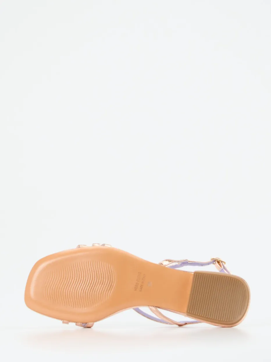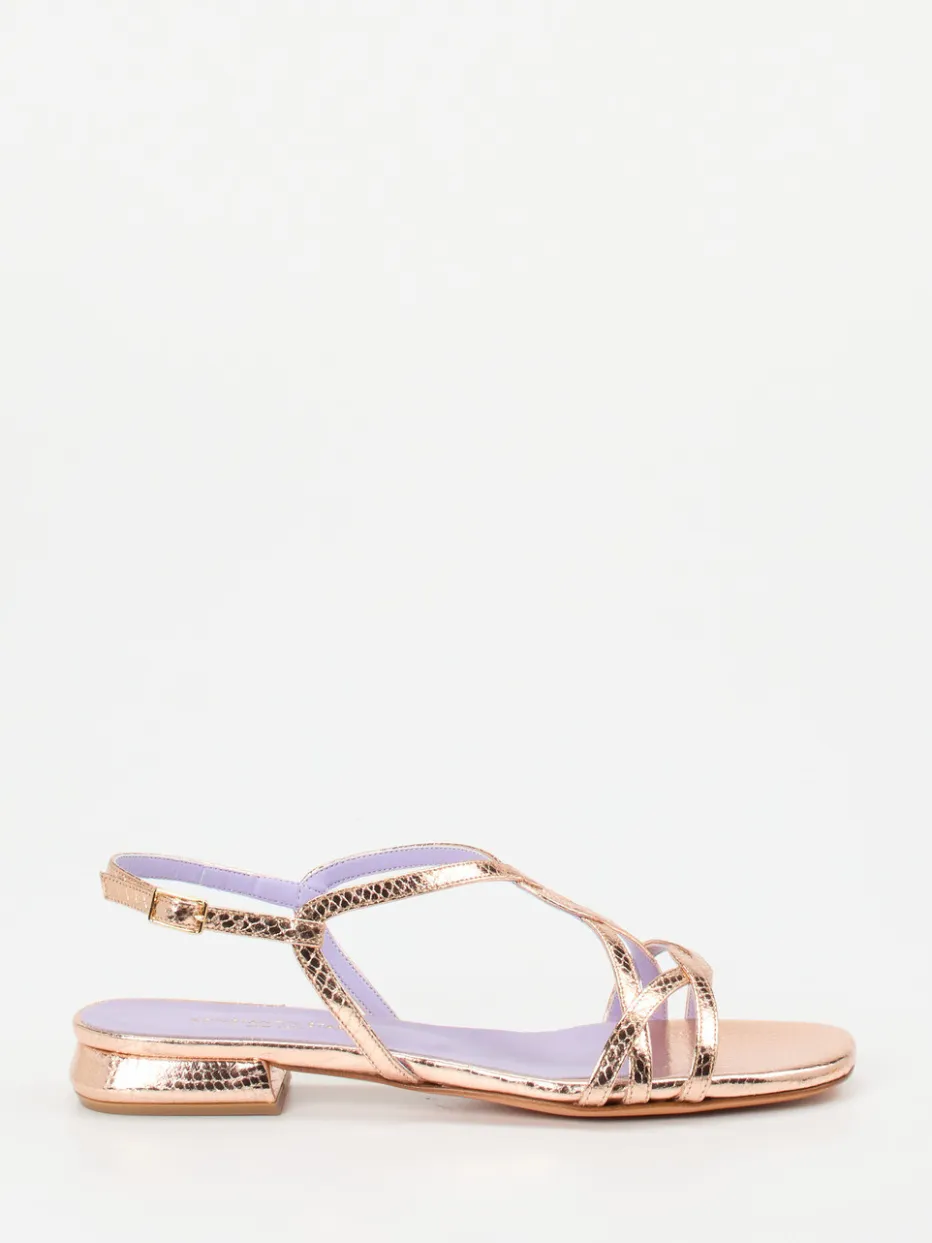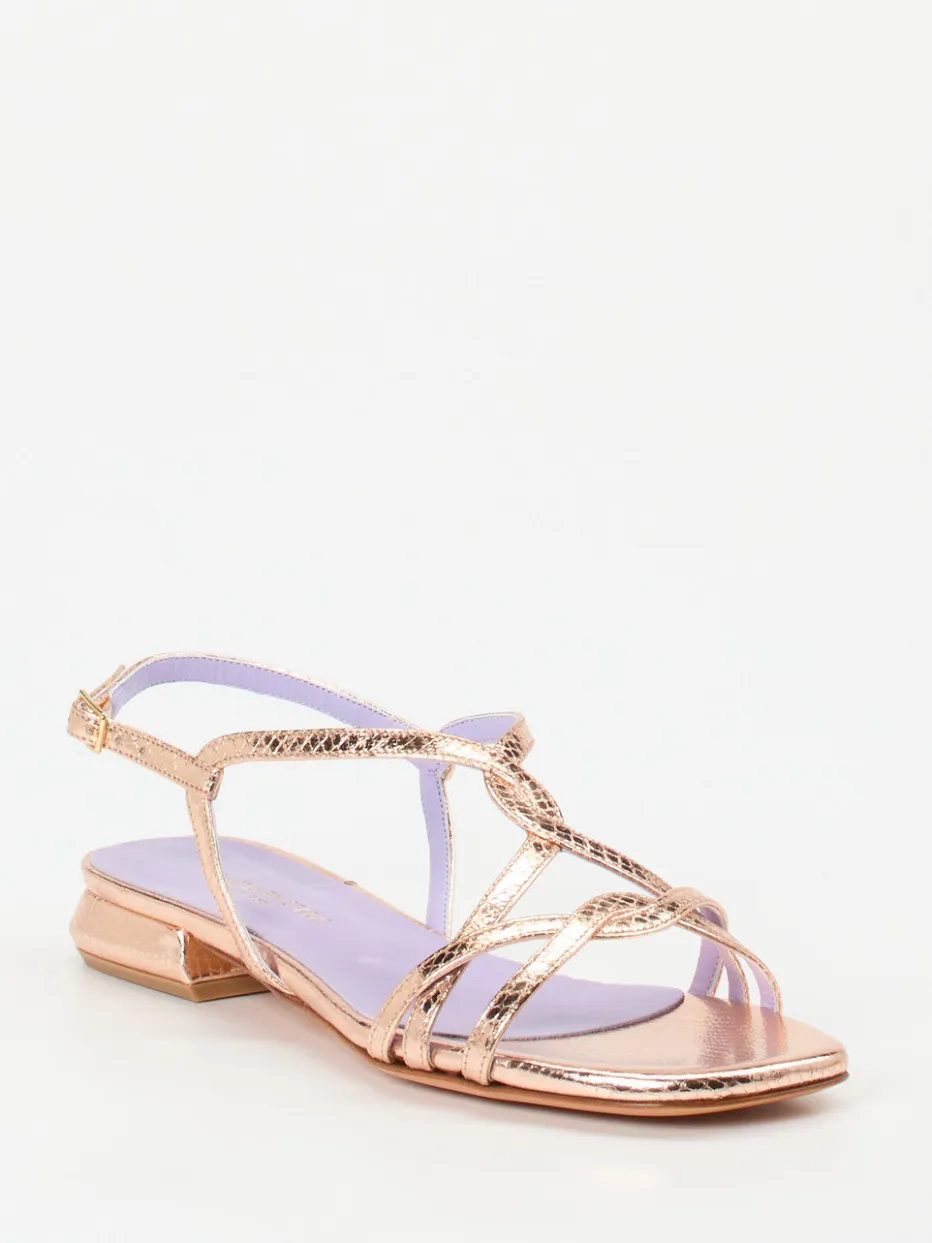 Glänzendes Metallicleder in Krokoprägung und filigrane Riemchenführung verleihen dieser Sandale aus Roségold modernen Retro-Charme mit femininer Leichtigkeit.