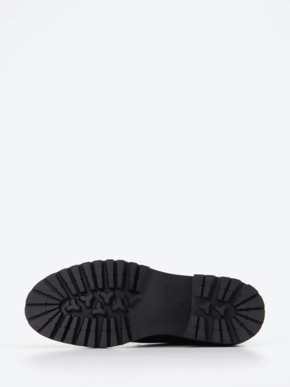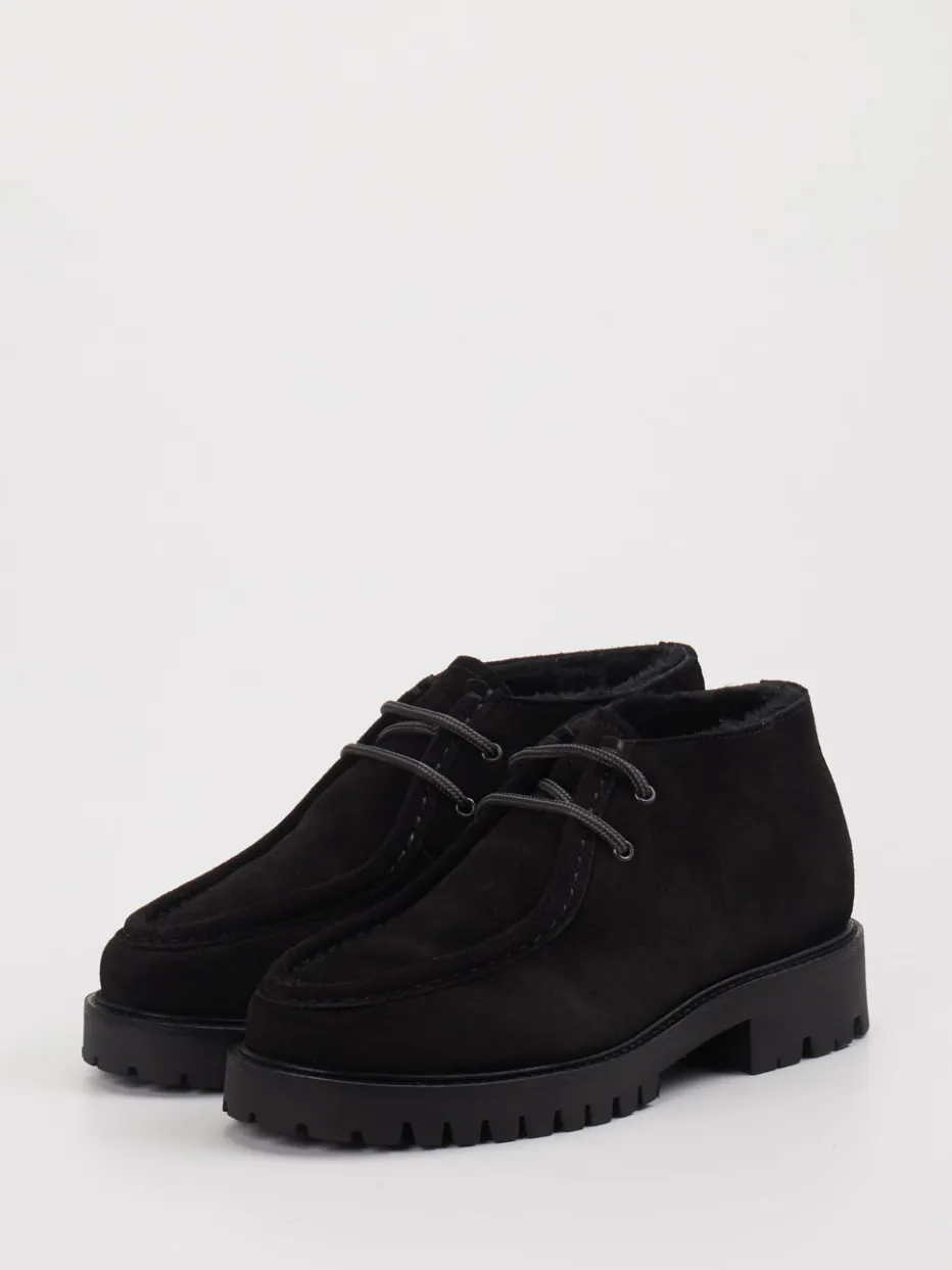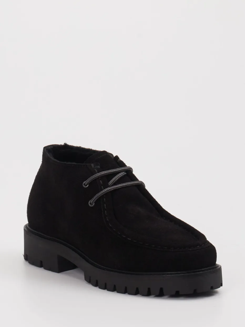 Urbaner Charme mit Outdoor-Profil. Konstantin Starke präsentiert eine hochwertige Schnürstiefelette, die Funktion und Stil vereint. Ideal für kühle Tage, bietet das Modell dank weichem Lammfellfutter angenehme Wärme. Das schwarze Veloursleder mit matter Oberfläche unterstreicht den minimalistischen Look, während Ton-in-Ton-Nähte und schwarze Metallösen dezente Akzente setzen. Die profilierte Gummisohle verleiht Trittsicherheit – ein zuverlässiger Begleiter im urbanen Alltag mit Outdoor-Bereich. Die klassische, runde Silhouette wirkt zeitlos und ergänzt lässige Herbst-Outfits, etwa mit Cargohose und Overshirt. Ein authentisches Statement für Komfort und urbanen Stil mit herbstlicher Haltung.