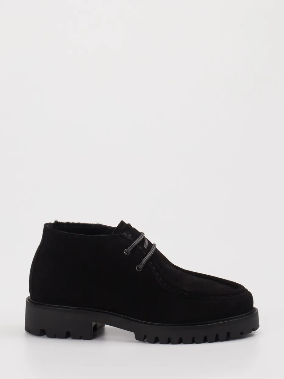 Diese Desert Boots aus schwarzem Veloursleder vereinen urbanen Minimalismus mit robuster Outdoortauglichkeit – perfekt für den Herbst in der Stadt.