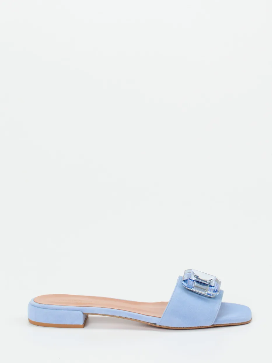 Eleganz in Pastell für warme Tage.Die Damen-Sandale von Konstantin Starke vereint Retro-Glam mit moderner Zurückhaltung. Ideal für sommerliche Events oder schicke Stadtbummel: Der offene Slide mit flacher Silhouette besteht aus samtigem Veloursleder in Hellblau. Ein rechteckiger, glitzernder Kristallstein auf dem breiten Riemen sorgt für einen luxuriösen Akzent, während das gepolsterte Lederfußbett mit Ledersohle Komfort bietet. Die klare Form und dezente Farbgebung spiegeln aktuelle „Quiet Luxury“-Trends wider. Passt perfekt zu fließenden Kleidern oder pastellfarbenen Accessoires. Ein stilprägender Sommerbegleiter mit modischem Understatement von Konstantin Starke.