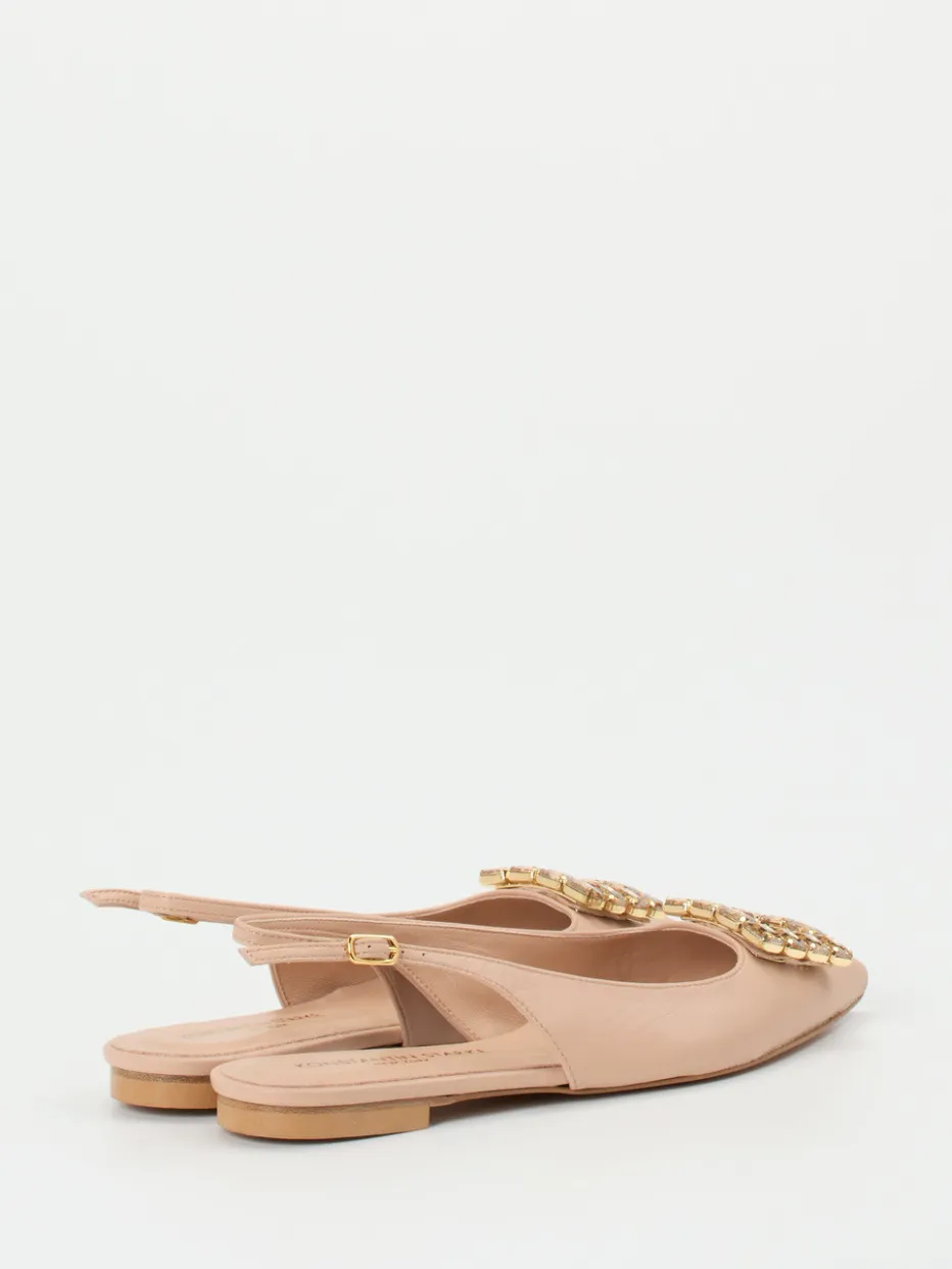 Der flache Schuh ist aus hochwertigem, nudefarbenem Lammleder gefertigt und besitzt eine glänzende Oberfläche. Die spitz zulaufende Form und eine goldfarbene Schmuckapplikation mit Kristallsteinen auf dem Blatt verleihen dem Modell eine feminine Raffinesse. Ein verstellbarer Fersenriemen mit filigraner Dornschließe sorgt für perfekten Halt. Durch die gepolsterte Ledersohle bleibt der Komfort auch an langen Tagen erhalten. Der Look transportiert Anklänge minimalistisch-vintager Ästhetik und passt zur ‚Quiet Luxury‘-Strömung. Kombiniert mit Seidenmaterialien oder einer passenden Clutch entsteht ein harmonisches Outfit.