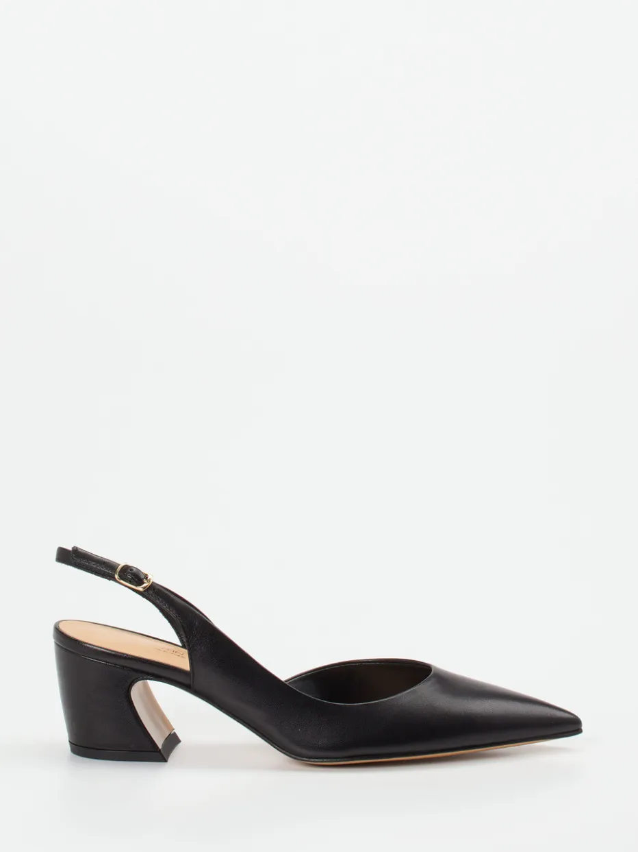 Feinstes schwarzes Lammleder trifft auf moderne Linienführung und skulpturalen Blockabsatz. Ein stilvoller Akzent für anspruchsvolle Business- und Abendlooks.