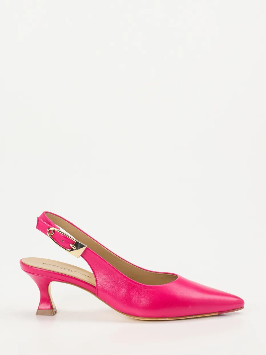 Barbiecore-Moment inklusive.Die Marke Konstantin Starke zeigt mit diesen Slingback-Pumps in Pink eine feminine Variante moderner Retro-Ästhetik. Für stilvolle Events oder unvergessliche Partynächte geschaffen, setzen die Pumps mit ihrem glänzenden Lammleder und dem sattfarbenen Pink ein klares Fashion-Statement. Ihre spitz zulaufende Silhouette, der filigrane Slingback-Riemen mit goldfarbener Schließe sowie der komfortable Tulpen-Kitten-Heel prägen ihren extravaganten Look. Der leicht gepolsterte Innenbereich und die glatte Ledersohle sorgen für angenehmen Tragekomfort. Inspiriert vom Y2K-Revival und perfekt für den Sommertrend „Barbiecore“. Ein femininer Stilverstärker mit modischer Aussagekraft.