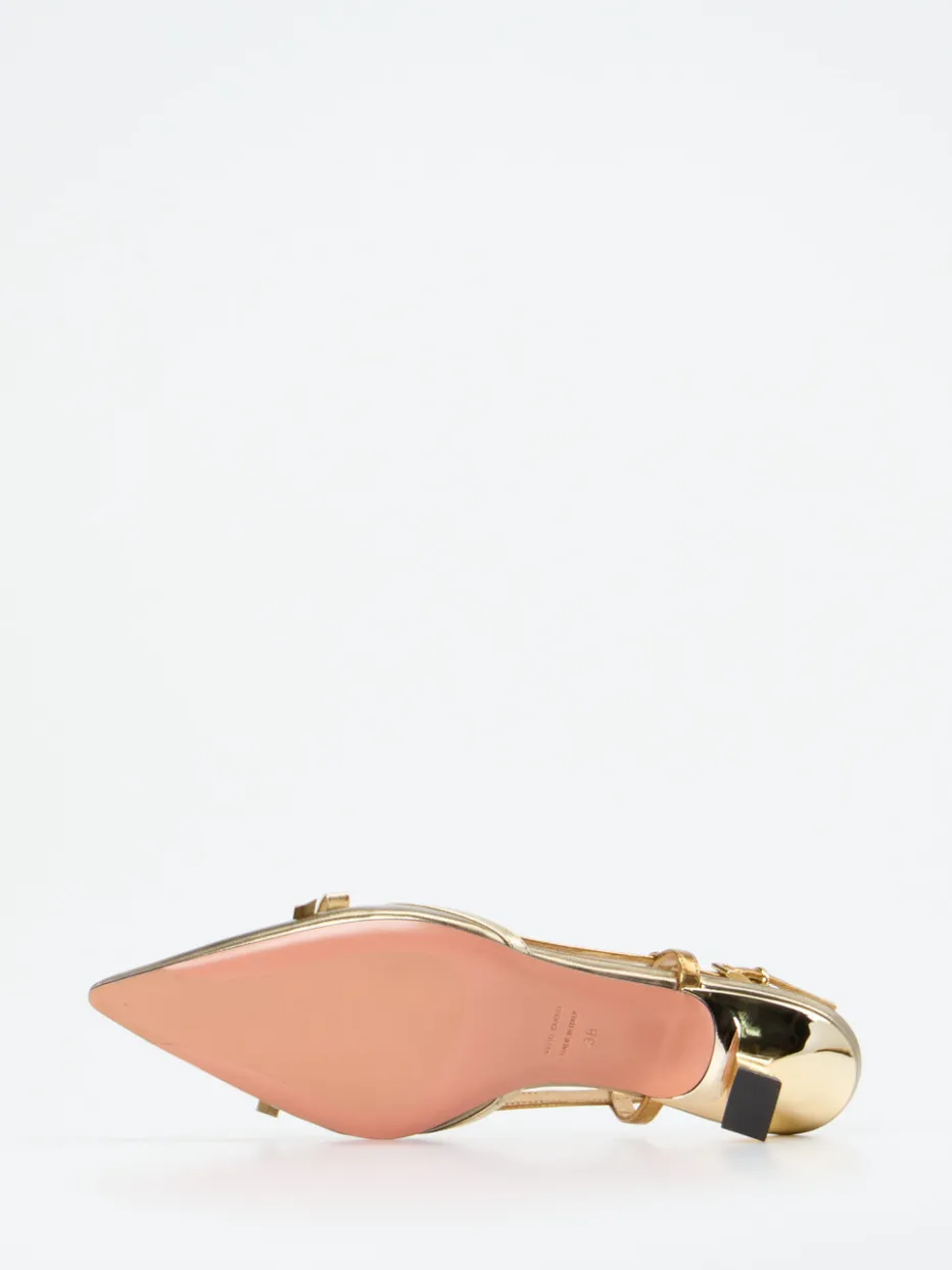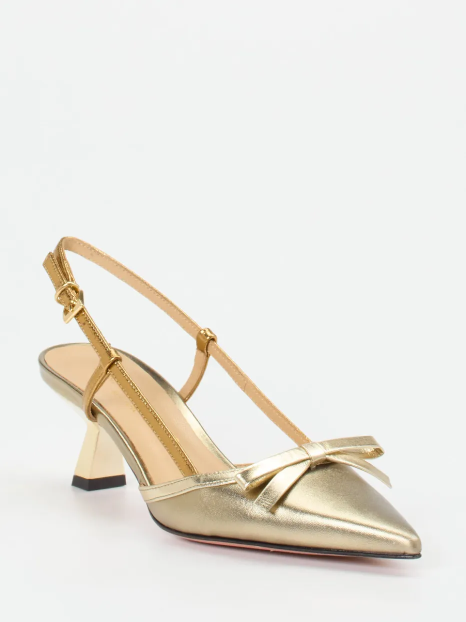 Für Abendveranstaltungen oder festliche Empfänge: Das Metallicleder in Gold verleiht dem Modell einen edlen Charakter und reflektiert im Licht mit subtiler Eleganz. Die spitz zulaufende Form, das zarte Schleifendetail auf der Vorderkappe sowie der skulpturale Kitten Heel mit lackierter Optik wirken ausgesprochen hochwertig. Der verstellbare Fersenriemen mit goldfarbener Schnalle sorgt für sicheren Halt. Innen überzeugt die gepolsterte Lederinnensohle aus Ziegenleder. Perfekt zu monochromen Outfits oder als akzentuierendes Highlight.