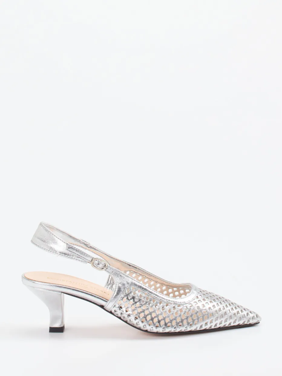 Für stilvolle Anlässe bei warmen Temperaturen konzipiert, begeistert der Slingback-Pump mit seinem metallisch glänzenden Obermaterial aus silberfarbenem Metallicleder. Die spitz zulaufende Form in Kombination mit Mesh-artigem Lochmuster wirkt feminin und raffiniert zugleich. Der Kitten Heel sowie der verstellbare Fersenriemen mit Schließe sorgen für eine komfortable Passform. Inspiriert vom Y2K-Trend und doch klar minimalistisch, passt der Look perfekt zu Party-Outfits oder eleganten Ensembles.