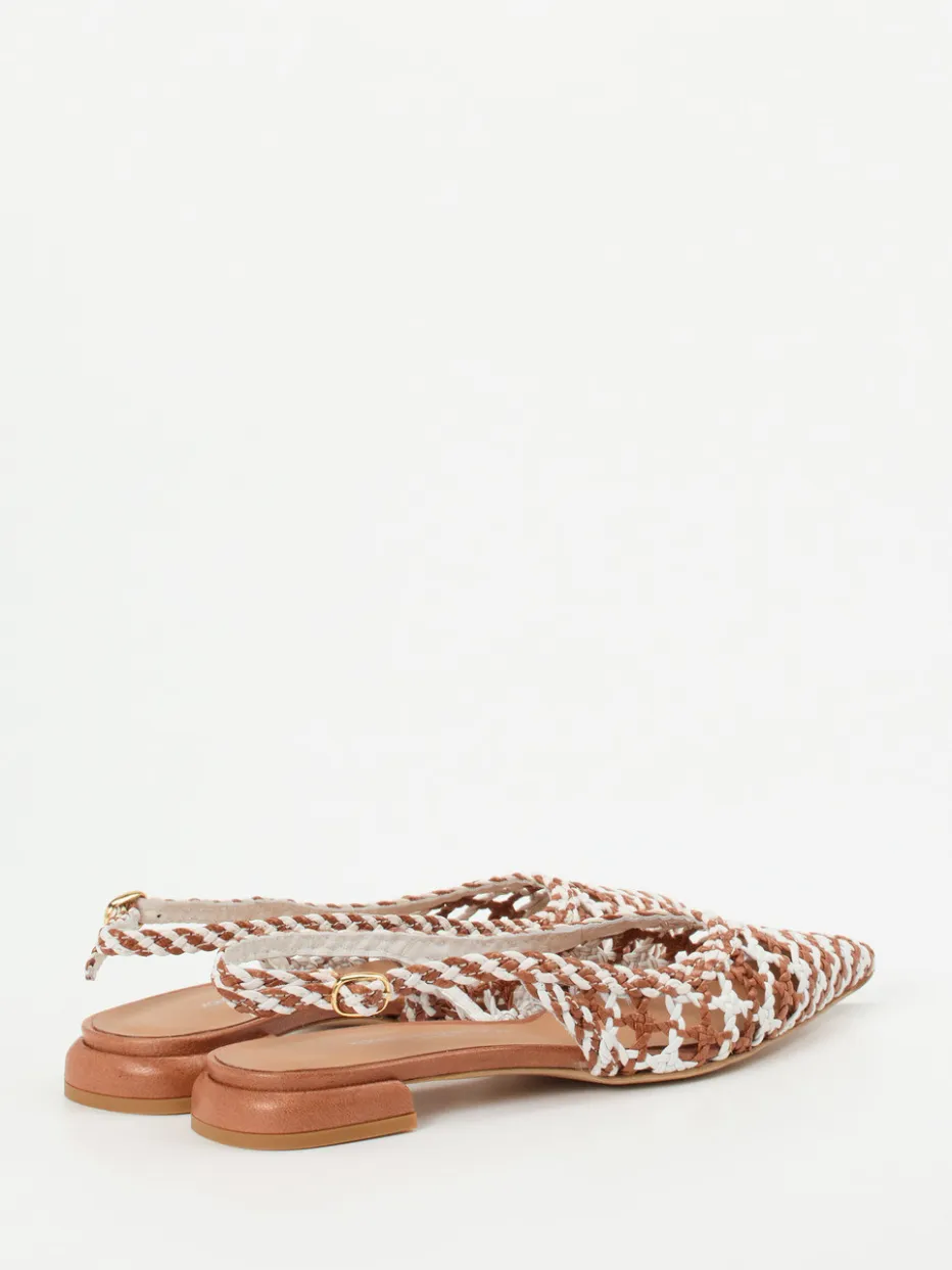Ideal für warme Tage in der Stadt oder im Urlaub überzeugt dieses Modell mit luftigem Flechtleder, samtig-matter Oberfläche und einer Farbkombination aus Rostbraun und Weiß. Die spitz zulaufende Form und die goldfarbene Schnalle am verstellbaren Fersenriemen unterstreichen den eleganten Look im Vintage-Stil. Eine gepolsterte Ledersohle sichert angenehmen Gehkomfort. Der flache, lederbezogene Blockabsatz macht die Schuhe zu kombifreundlichen Begleitern zu Leinenkleid oder Marlenehose.