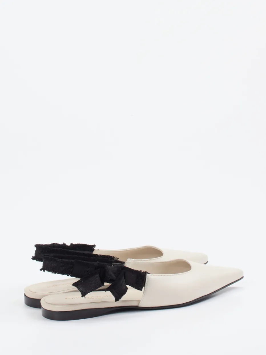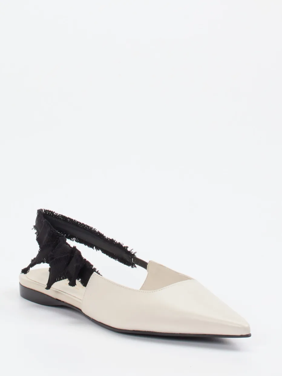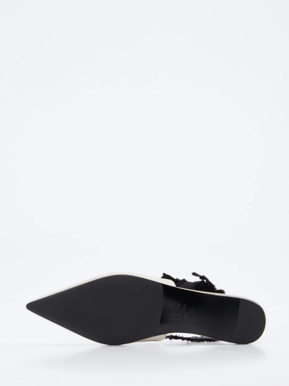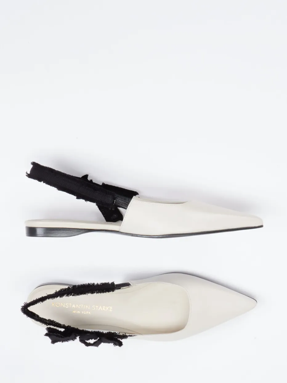 Raffinierter Kontrast mit Retro-Flair.Konstantin Starke präsentiert Slingpumps für Damen, die Modernität und feine Details verbinden. Ideal für Tage, an denen Eleganz und Komfort gefragt sind. Diese cremeweißen Ballerinas aus hochwertigem Kalbleder zeigen eine spitz zulaufende Form und setzen mit dem fransigen, schwarzen Textilfersenband und der Zierschleife ein ausdrucksstarkes Detail. Das softe Innenfutter aus Lammnappa sorgt für angenehmen Tragekomfort, während die flache Ledersohle mit Gummiintarsien sicheren Halt bietet. Modisch verorten sich die Schuhe im Retro-Chic und „Quiet Luxury“-Trend. Stilistisch passend zu Hobo-Bag oder Leinenrock. Formstarke Leichtigkeit mit markentypischer Detailverliebtheit.