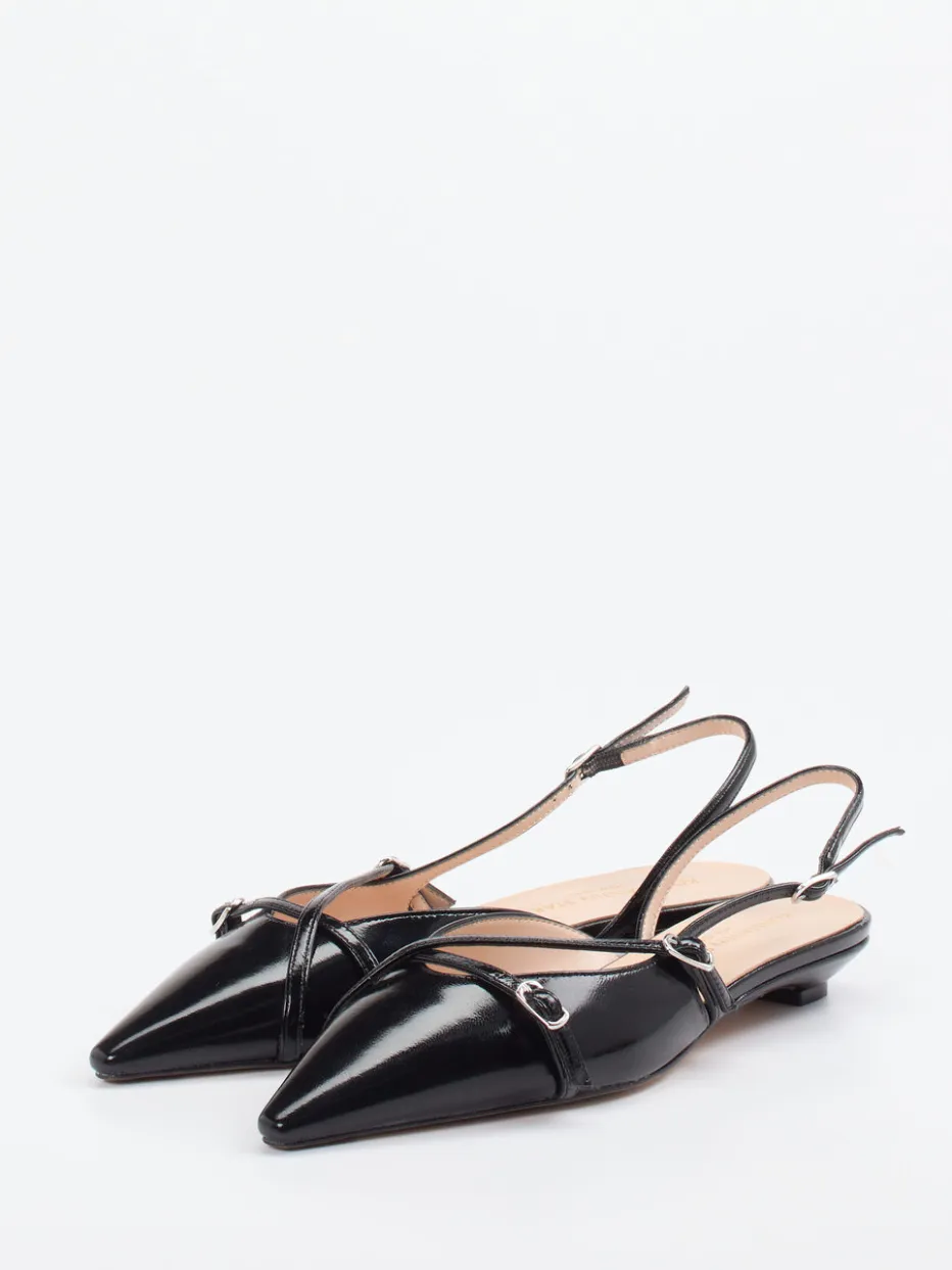 Diese Slingpumps vereinen glänzendes Lackleder mit pointierter Eleganz und dezenter Raffinesse – ein stilvoller Akzent für anspruchsvolle Anlässe.