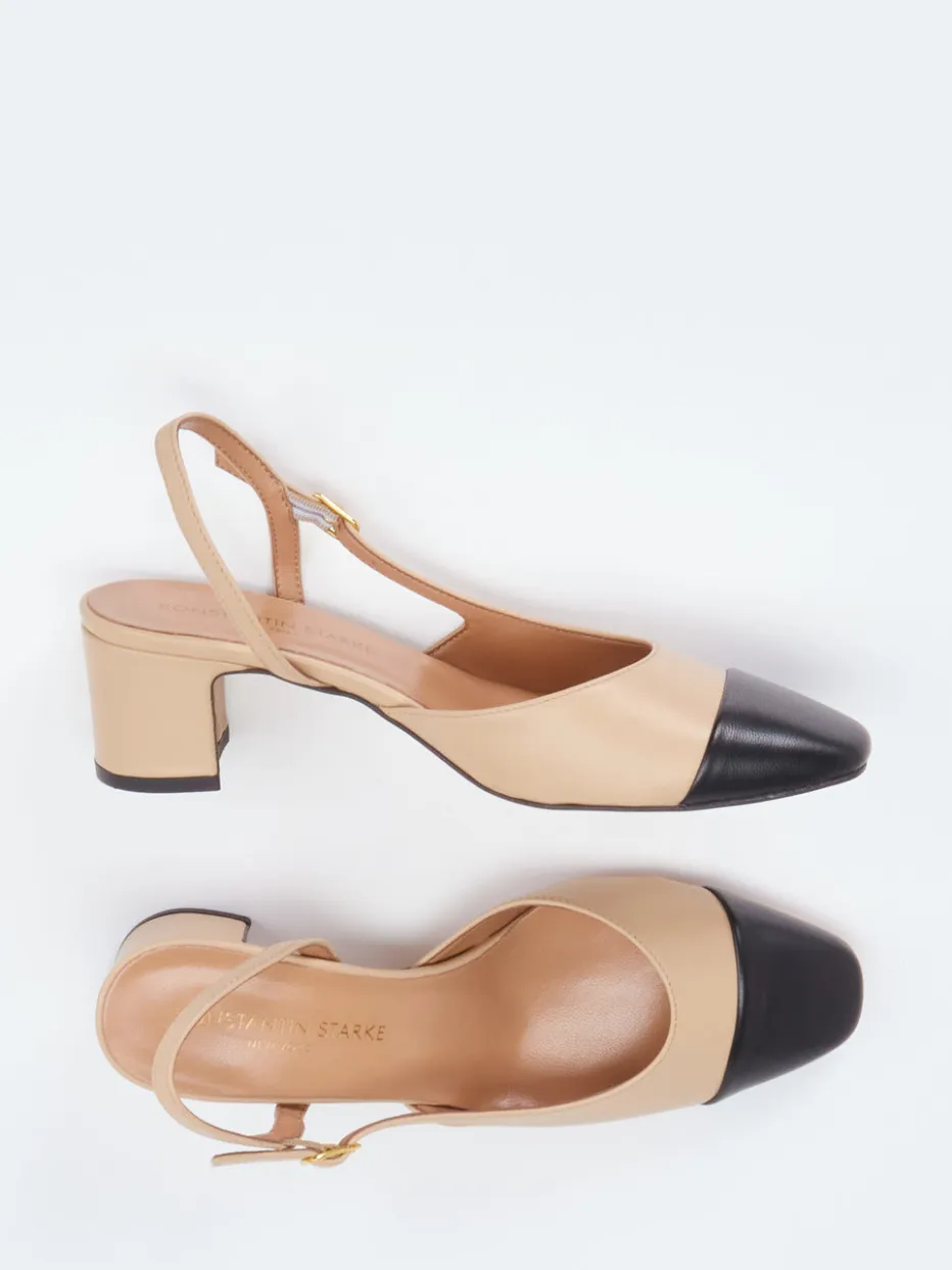 Ob im stilvollen Office-Setting oder zu festlichen Anlässen – dieser Pump vereint Komfort mit zeitloser Eleganz. Hergestellt aus anschmiegsamem Lammleder mit matter Oberfläche, fügt sich das Duo aus Beigeton und schwarzer Zehenkappe harmonisch in minimalistische Looks. Die klassische, leicht spitz zulaufende Form und der bequeme Blockabsatz stehen für souveräne Alltagstauglichkeit. Goldfarbene Schnalle und Slingback-Riemen setzen stilistische Akzente, während der Color-Blocking-Look dezente Luxus-Signale vermittelt. Ideal in Kombination zu monochromen Styles oder neutralen Ensembles.