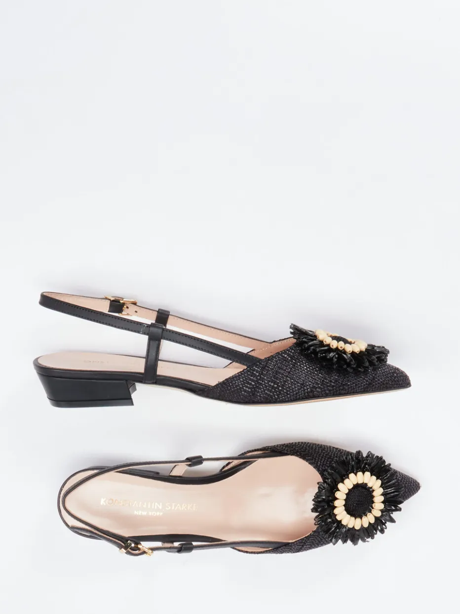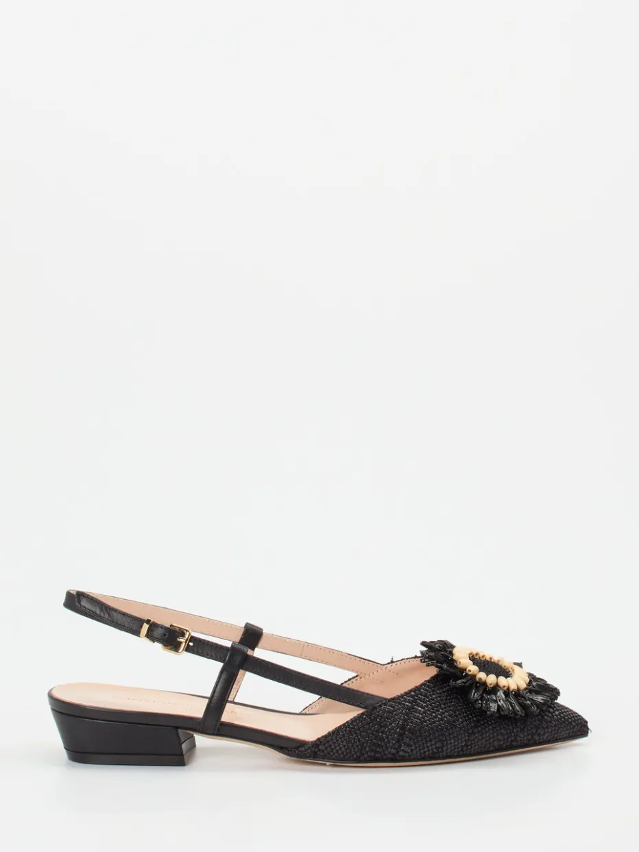 Ideal für Sommerabende oder gehobene Anlässe: Das schwarze Textilmaterial mit leicht genarbter Baststruktur wird durch einen auffälligen Blütenschmuck auf dem Blatt geschmückt. Die Kombination aus spitzer Silhouette, verstellbarem Fersenriemen mit goldfarbener Metallschnalle und einer flachen Ledersohle unterstreicht den stilvoll vintage-inspirierten Charakter. Innen sorgt hochwertiges Kalbleder für angenehmen Komfort. Ein Hingucker zu leichten Kleidern oder Seiden-Looks.