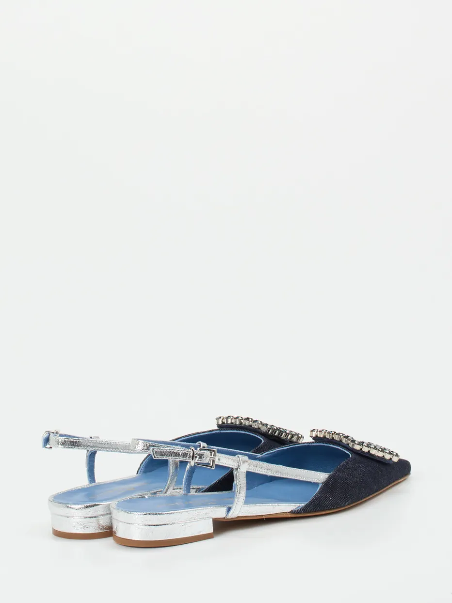 Modischer Materialmix mit Vintage-Attitüde.Die Slingpumps von Konstantin Starke interpretieren klassische Ballerinas mit spitzer Form und extravagantem Stil. Ein ausdrucksstarker Mix aus dunkelblauem Textil in Jeansoptik und silberfarbenem Metallicleder setzt modische Kontraste. Die fein genarbte Oberfläche sowie die strassverzierte Zierschnalle am Riemen unterstreichen den luxuriös-minimalistischen Look. Mit verstellbarem Fersenriemen und einer hochwertigen Ledersohle bieten sie angenehmen Tragekomfort. Inspiriert von 90s-Chic trifft das Design den aktuellen „Quiet Luxury“-Trend. Lässt sich ideal zu monochromen Ensembles oder Denim-Looks kombinieren. Ein stilvoller Akzent für Anspruch und Alltag.