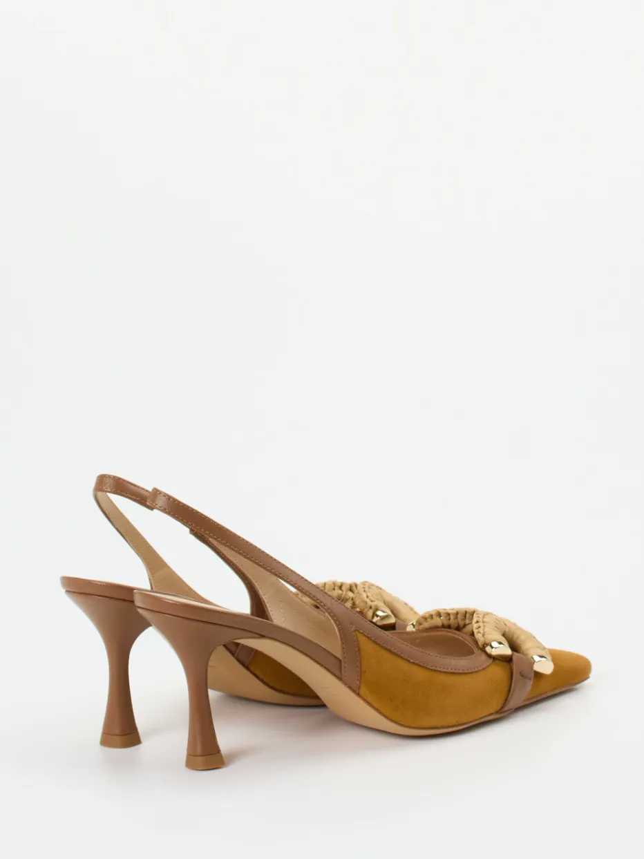 Ob für sommerliche Gartenfeste oder stilvolle City-Momente – das cognacfarbene Veloursleder, samtig und matt, bildet zusammen mit nussbraunem Glattleder und geflochtenen Bastdetails eine stimmige Komposition. Die schlanke, spitz zulaufende Form unterstreicht den eleganten Look, akzentuiert durch eine kunstvolle Frontverzierung mit goldfarbenen Metallkappen. Dank elastischem Fersenriemen und lederbezogenem Komfortfußbett gelingt ein angenehmes Tragegefühl. Der Look reflektiert Trends wie „Crafted Details“ mit einem Hauch Retro-Feminität und passt hervorragend zu luftigen Leinenkleidern.