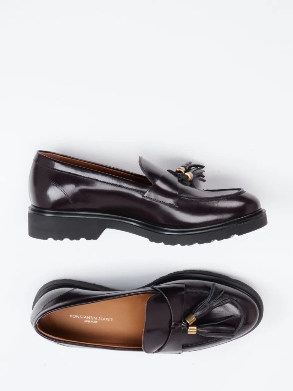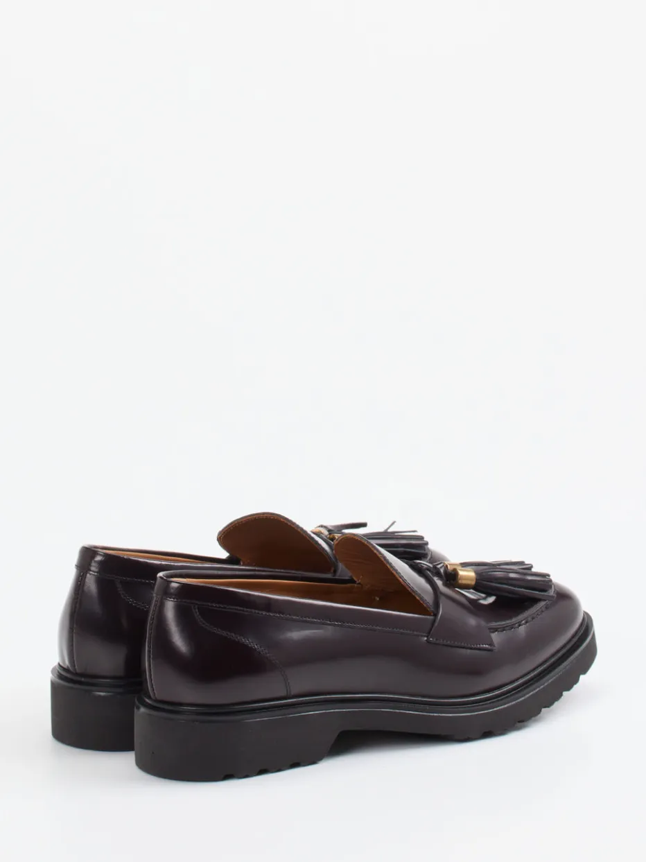 Feines Kalbleder in dunklem Bordeaux mit glänzender Oberfläche und goldfarbenem Tassel-Detail verbindet klassische Eleganz mit modernem Understatement.
