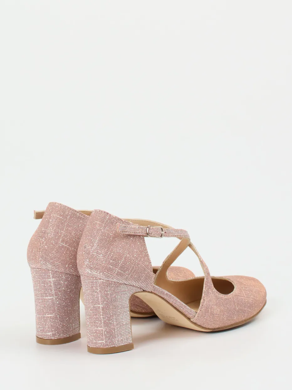 Ein femininer Mary-Jane-Pumps mit funkelnder Glitzerstruktur in Roségold und komfortabler Passform für elegante Anlässe.