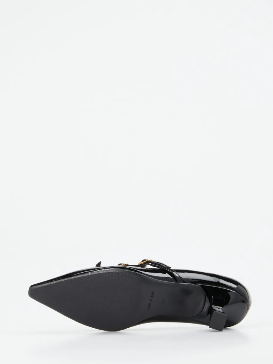 Konstantin Starke interpretiert klassische Damenpumps neu: Diese Spangenpumps überzeugen durch ihre schwarz-glänzende Lacklederoptik und feminine Silhouette.