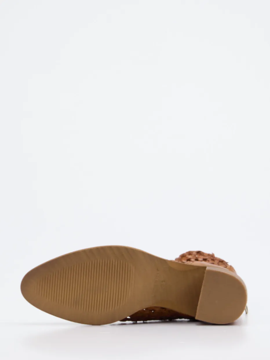 Ob beim Stadtbummel oder im Urlaub – das cognacfarbene Flechtleder mit matter Oberfläche sorgt für angenehme Luftzirkulation und natürlichen Stil. Die klassische knöchelhohe Form wird durch einen dezenten Fersenreißverschluss ergänzt, der den Einstieg erleichtert. Der 6 cm hohe Blockabsatz und die rutschhemmend profilierte Gummisohle in Holzoptik bieten Komfort mit modischem Anspruch. Inspiriert von sommerlichen Boho-Trends lässt sich dieses Modell ideal zu Kleidern oder leichten Stoffhosen kombinieren.