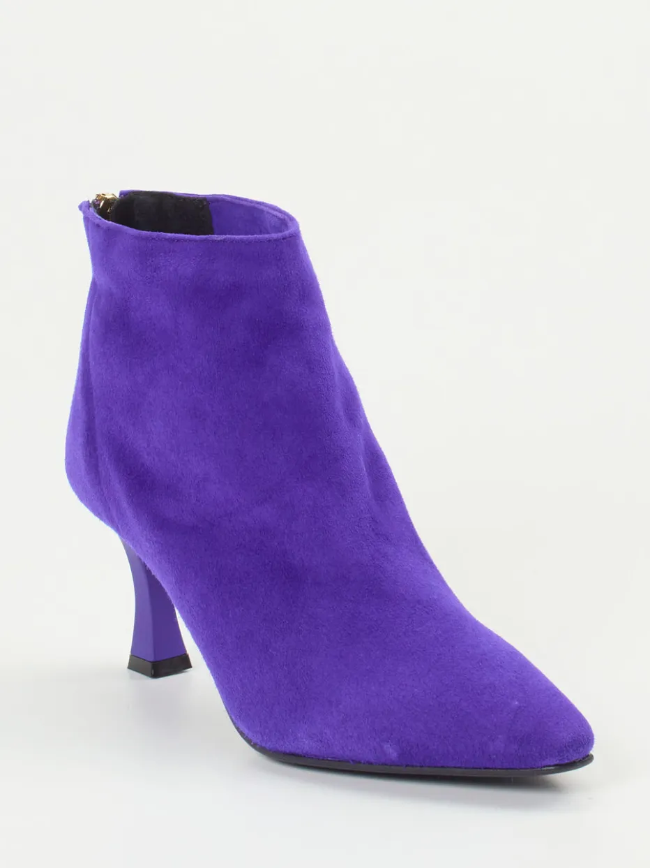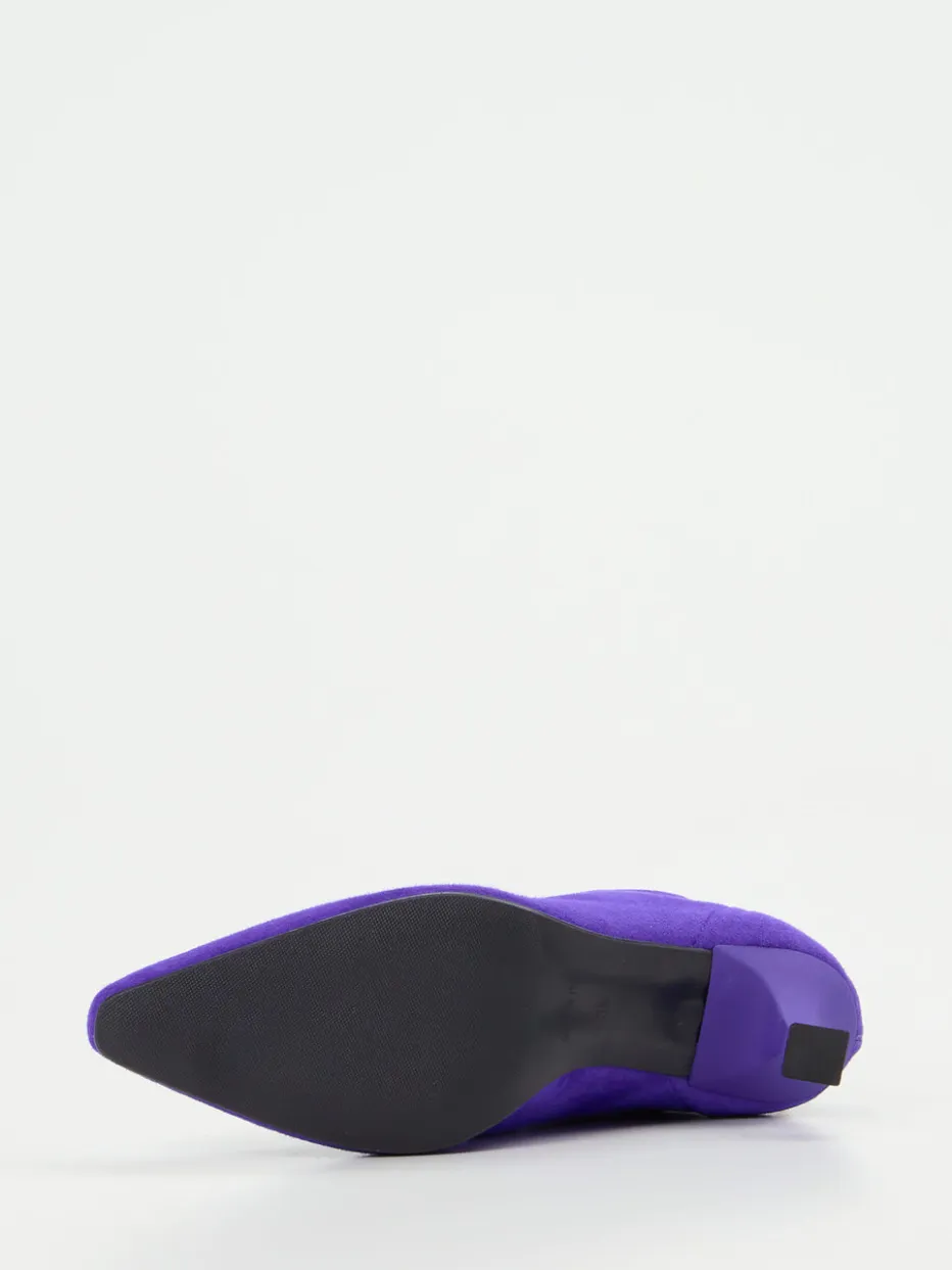 Violetter Chic auf hohem Niveau.Konstantin Starke präsentiert eine modische Damen-Stiefelette für stilvolle Auftritte im Alltag oder abends. Das violette Veloursleder ist weich strukturiert und zeigt in Kombination mit der spitz zulaufenden Front eine moderne, feminine Silhouette. Ein goldfarbener Reißverschluss an der Ferse ergänzt den monochromen Look mit edlem Kontrast. Der ca. 7 cm hohe Kitten Heel sorgt für eleganten Auftritt und angenehme Laufhöhe zugleich. Inspiriert von Streetstyle und Minimalismus, passt dieses Modell ideal zu Color-Blocking- oder Ton-in-Ton-Outfits. Ein Stylingpartner: metallische Accessoires. Ein Eyecatcher mit klarer Formensprache und zeitgemäßem Stilgefühl.