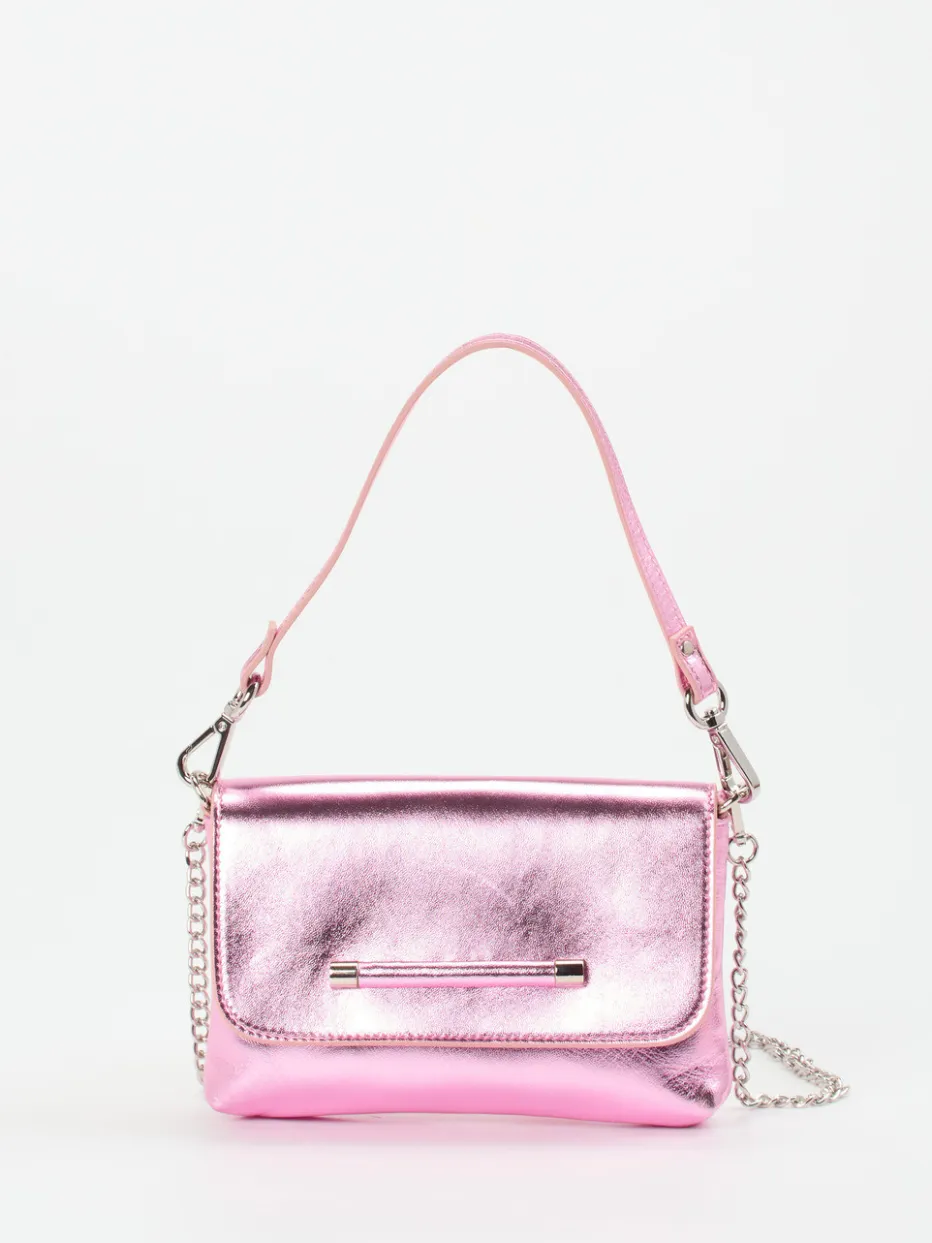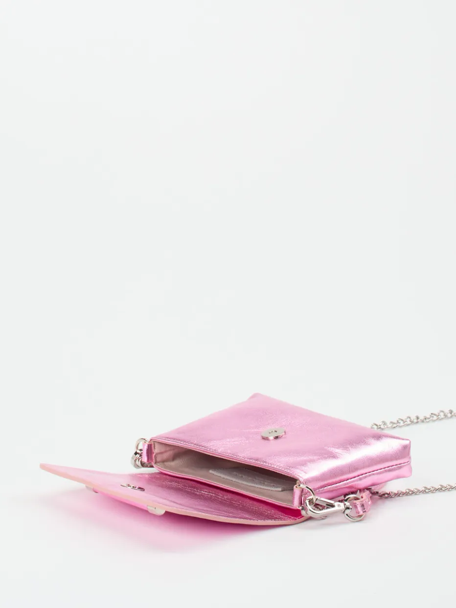 Zum Highlight jeder glamourösen Garderobe wird diese Umhängetasche der Marke Konstantin Starke. Das rosafarbene Metallicleder besticht im All-over-Look und lässt sich durch sein schlichtes Design perfekt kombinieren. Praktischerweise kann zwischen einem zierlichen Lederhenkel und einem Schulterriemen gewechselt werden, der als filigrane, silberfarbene Kette daherkommt und so den eleganten Anspruch der Tasche unterstreicht. Ganz unkompliziert öffnen und schließen lässt sich der dezente Magnetverschluss. Der Innenraum wartet mit genügend Raum für die wichtigsten Utensilien wie Portemonnaie, Handy und Lippenstift auf. Ein zeitloses Fashion-Statement, das für sich steht! – Obermaterial: Metallicleder – Futter: Textil – Farbe: rosa – Größe: ca. 12 x 19 x 4 cm (H x B x T) – Schulterriemen: ca. 120 cm – Verschluss: Magnetknopf
