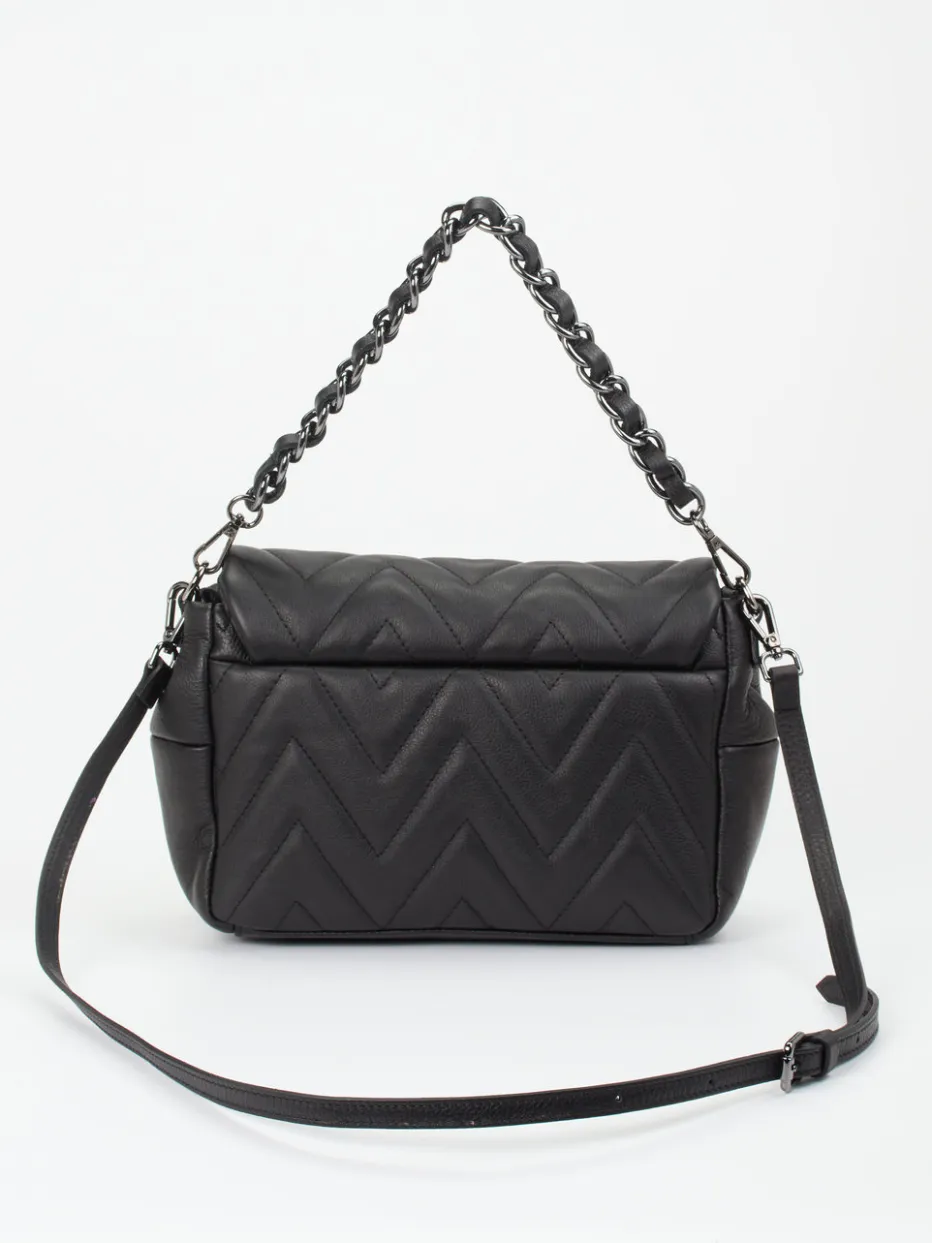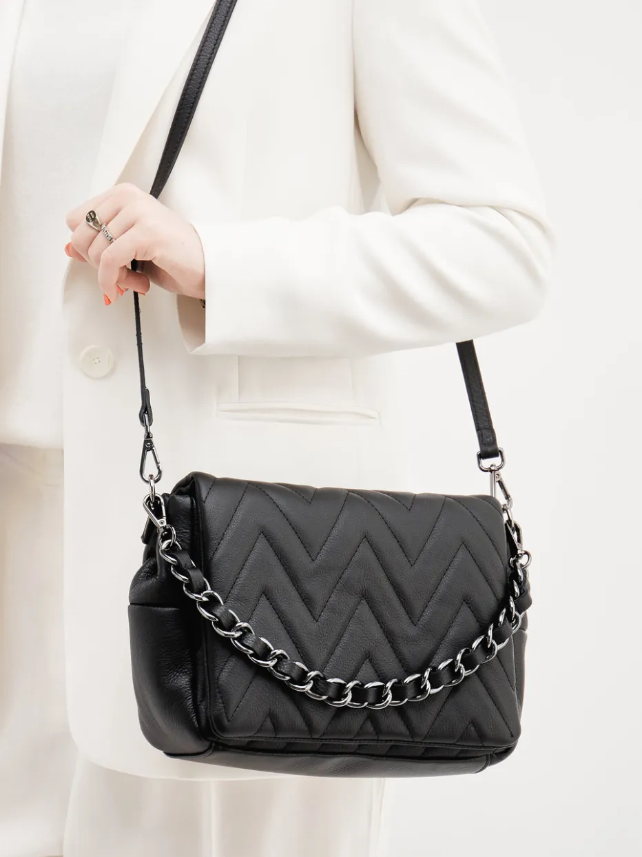 Die elegante Umhängetasche überzeugt mit hochwertigem Kalbleder, moderner Steppung und markanter Statement-Kette – ein puristisches It-Piece für anspruchsvolle Looks.