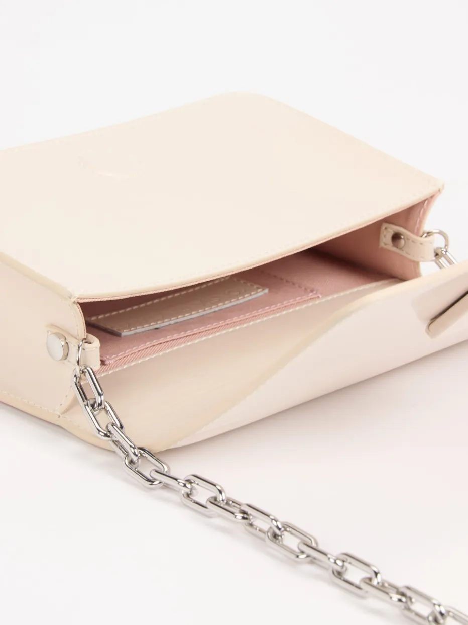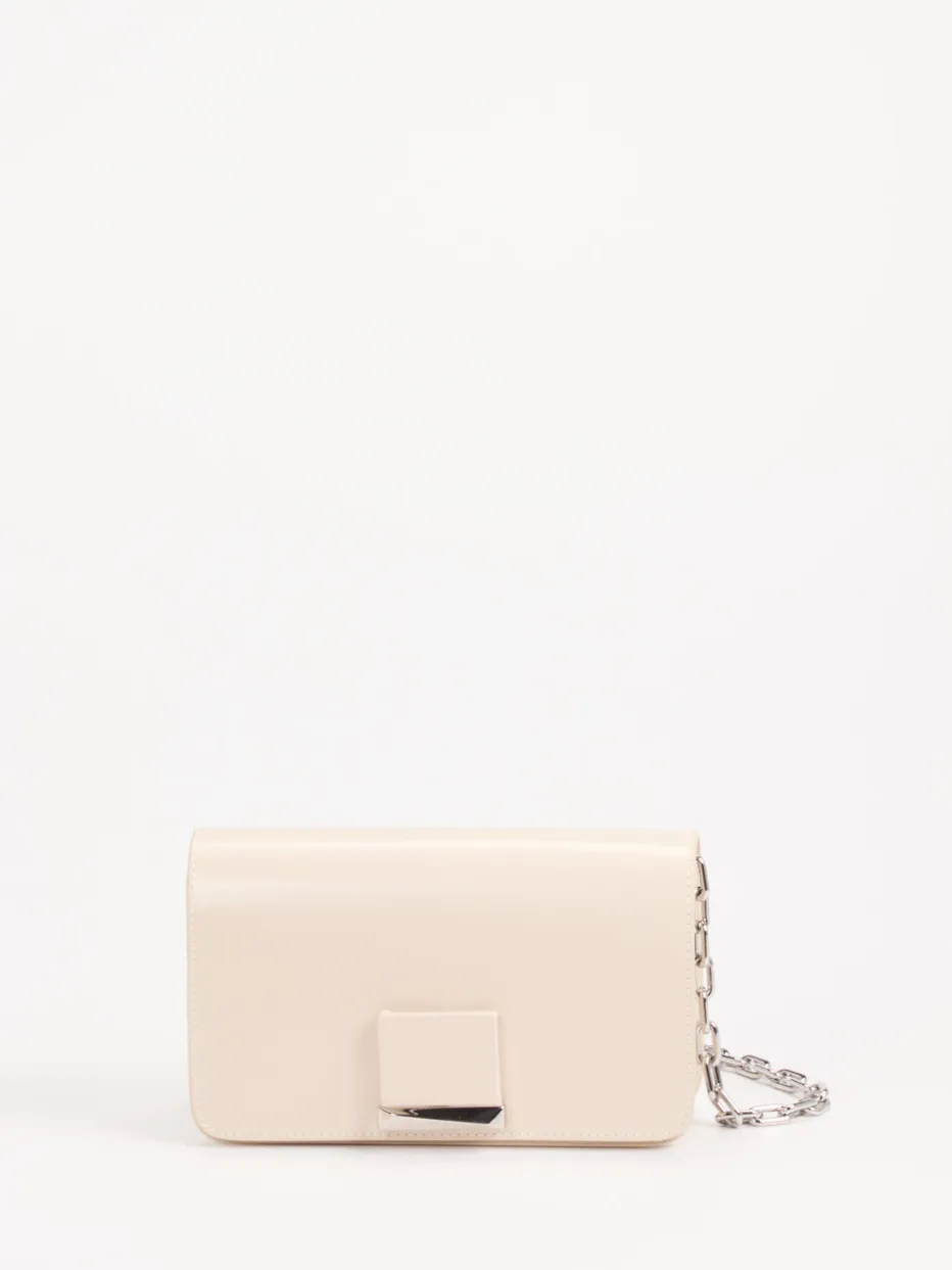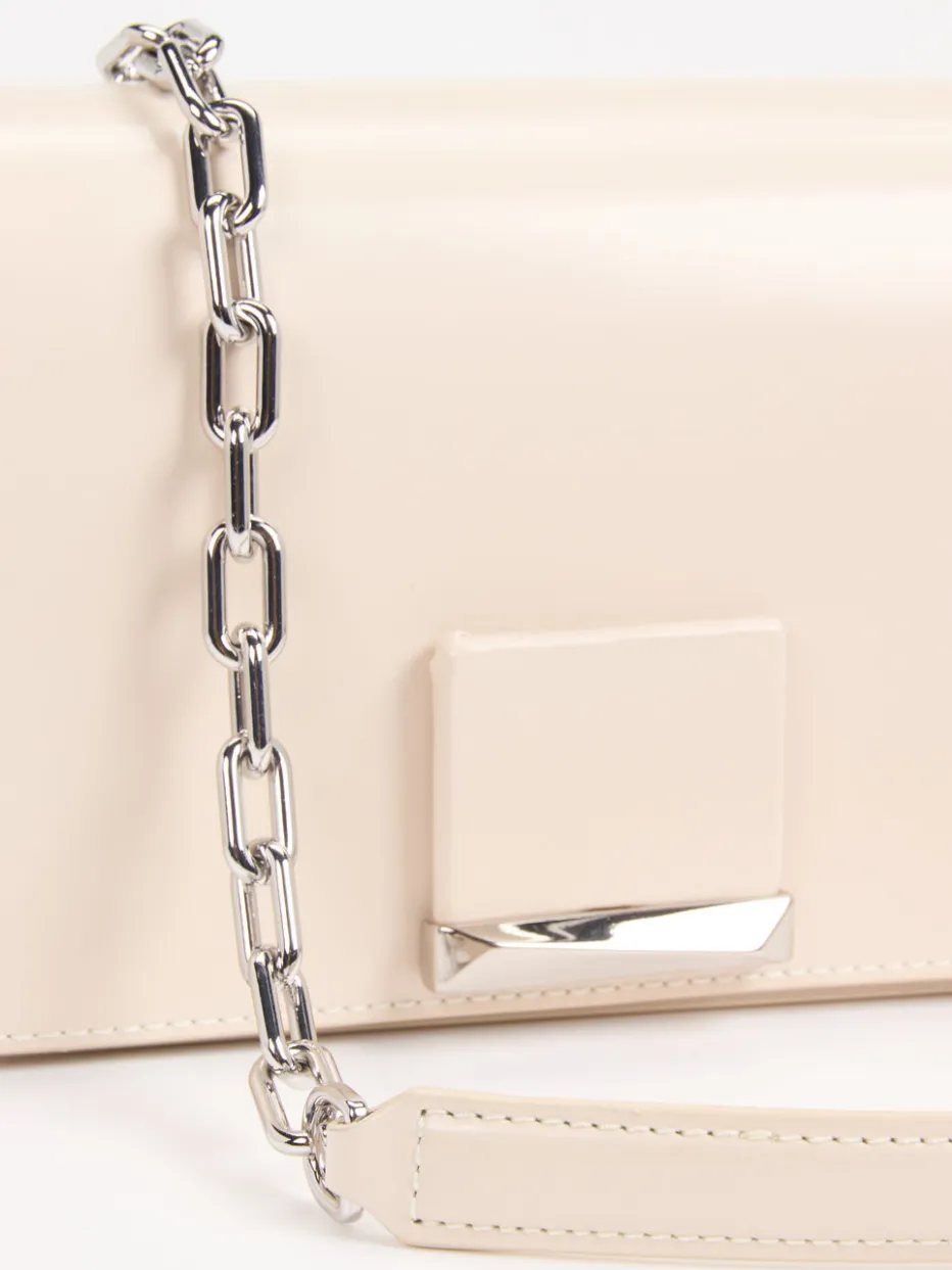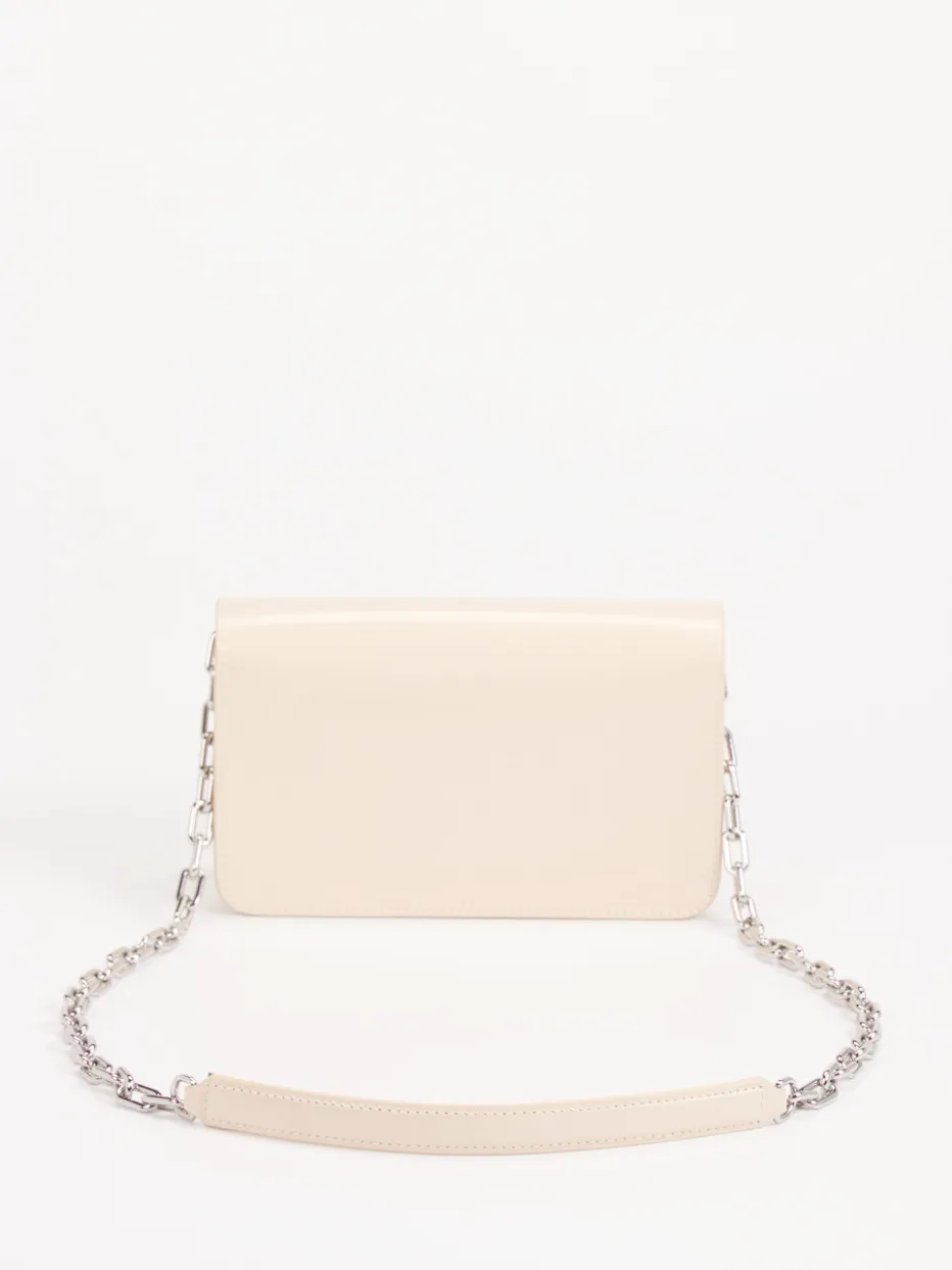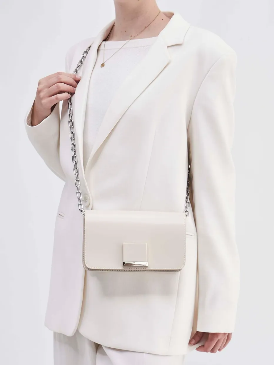 Diese Umhängetasche verbindet minimalistisches Design mit luxuriösen Details – glänzendes Finish, silberne Kettenglieder und klare Silhouette setzen stilvolle Akzente.