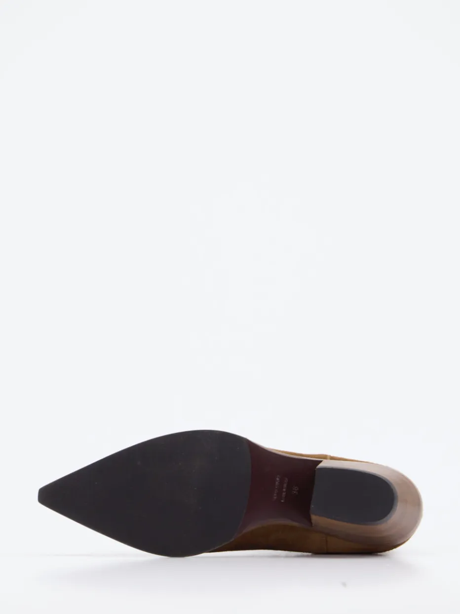 Diese Stiefelette aus samtigem Veloursleder besticht durch klare Linien und ein dezentes Western-Flair – ideal für minimalistische Looks mit Charakter.