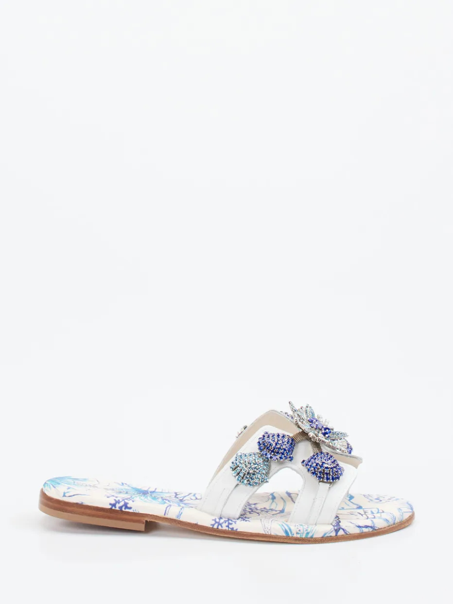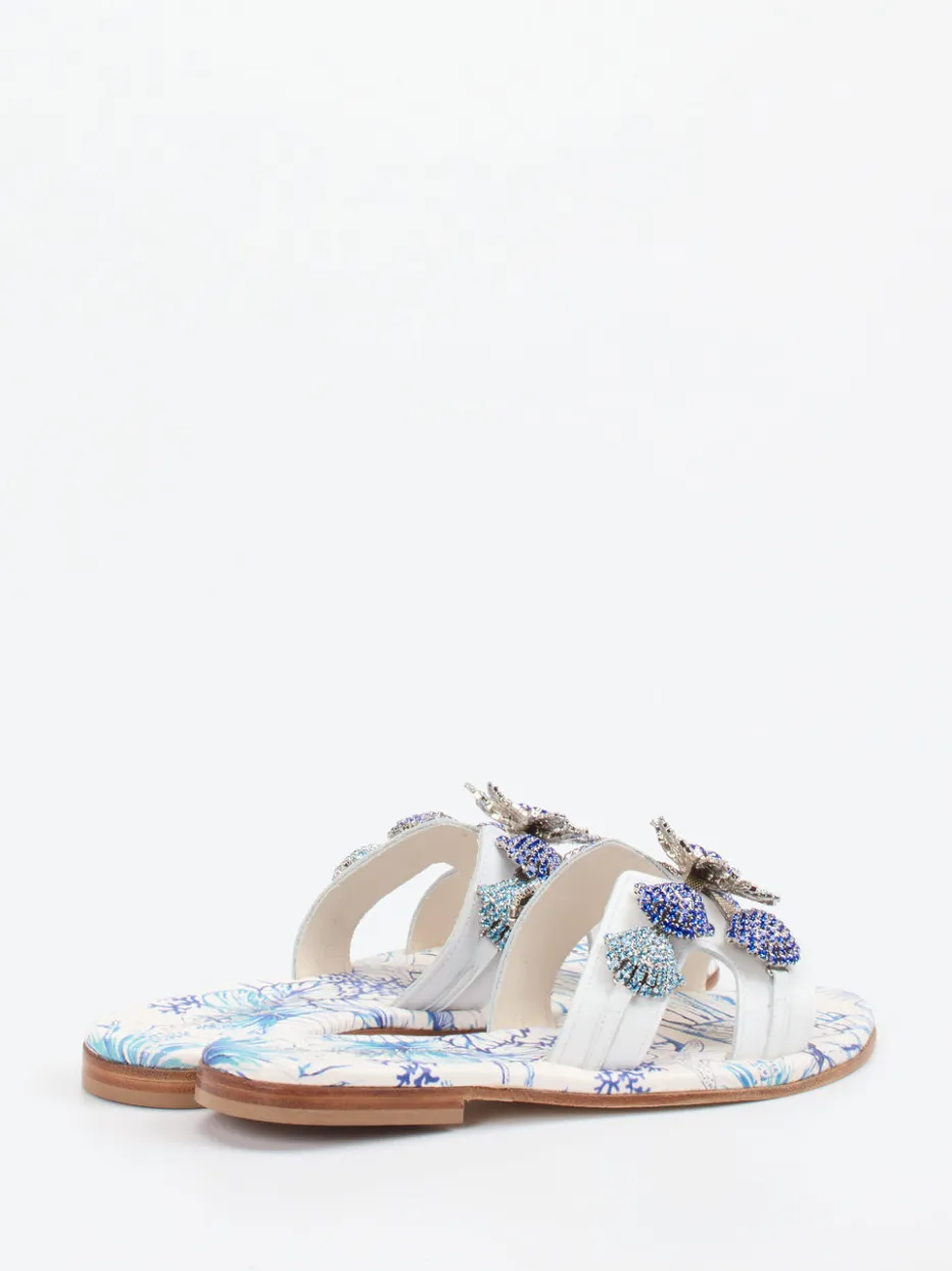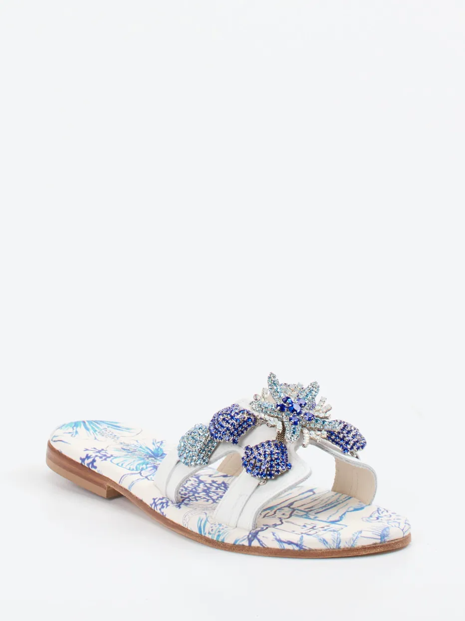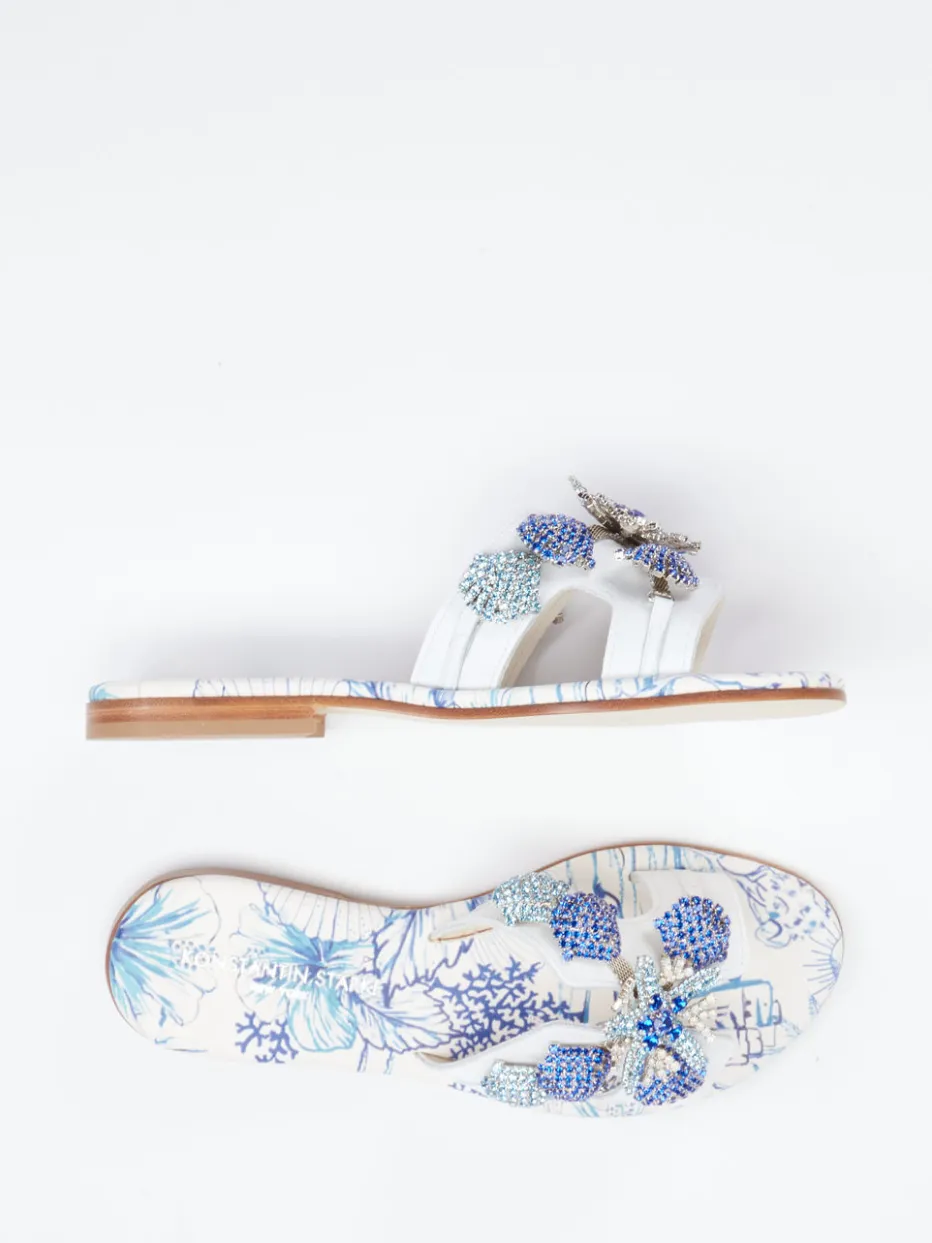 Sommerlicher Eyecatcher mit maritimen Details.Konstantin Starke interpretiert Zehensandalen auf verspielte und gleichzeitig elegante Weise. Ob am Strandboulevard oder beim Stadtbummel – das zart glänzende Lammleder sorgt für angenehmen Tragekomfort. Strassverzierte Applikationen in Muschel- und Seesternform und ein florales Muster auf der Innensohle heben das maritime Thema hervor. Die dominante Weiß-Blau-Kombination unterstreicht den frischen Resort-Charakter. Schlupfform und flache Bauweise machen das Modell ideal für warme Sommertage. Inspiriert von aktuellen Trends rund um „Urlaubs-Florals“ und „Glamour-Elemente“. Kombiniert zu fließenden Kleidern oder leichten Hosen, entfaltet der Look besondere Wirkung. Ein Zumnorde-Favorit für anspruchsvolle Designliebhaberinnen mit Sinn für Details.