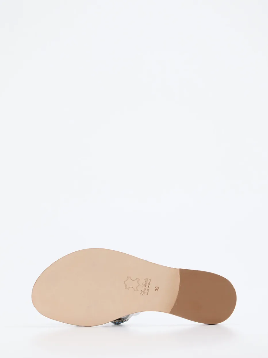 Diese flachen Damen-Zehensandalen aus feinem Lammleder verbinden sommerliche Leichtigkeit mit maritimem Glamour – ideal für stilvolle Resort-Looks und entspannte Tage am Meer.