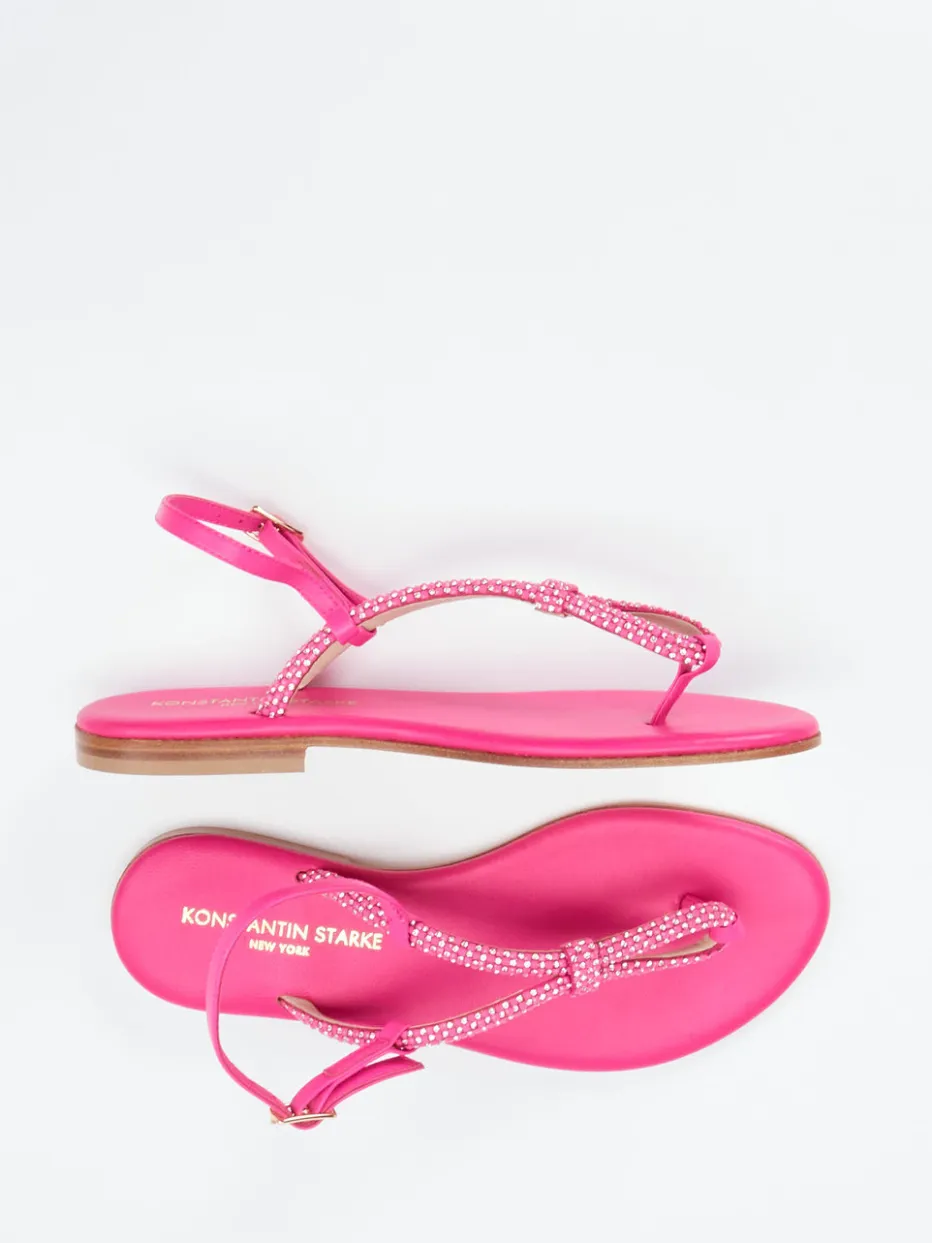 Strahlendes Highlight für warme Tage.Konstantin Starke präsentiert eine Damen-Zehentrenner-Sandale, die sommerliche Trends gekonnt aufgreift. Für Citytrips, entspannte Sommertage oder als Partypiece bietet das Paar mit glänzendem Metallicleder in knalligem Pink auffällige Akzente. Funkelnde Strasssteinchen auf dem Zehenriemen und eine goldfarbene Dornschließe setzen glamouröse Highlights. Die flache Silhouette mit weich gepolstertem Lederfußbett sowie die italienische Ledersohle stehen für stilvolle Qualität. Trendstarke Einflüsse wie „Barbiecore“ und Y2K-Ästhetik treffen auf alltagstaugliche Eleganz. Ideal kombinierbar mit weißen Sommerkleidern oder metallicfarbenen Accessoires. Ein modischer Sommerbegleiter mit Stilbewusstsein und Qualitätsanspruch.