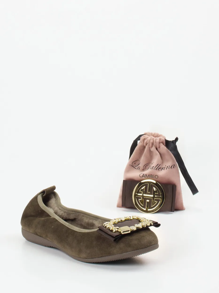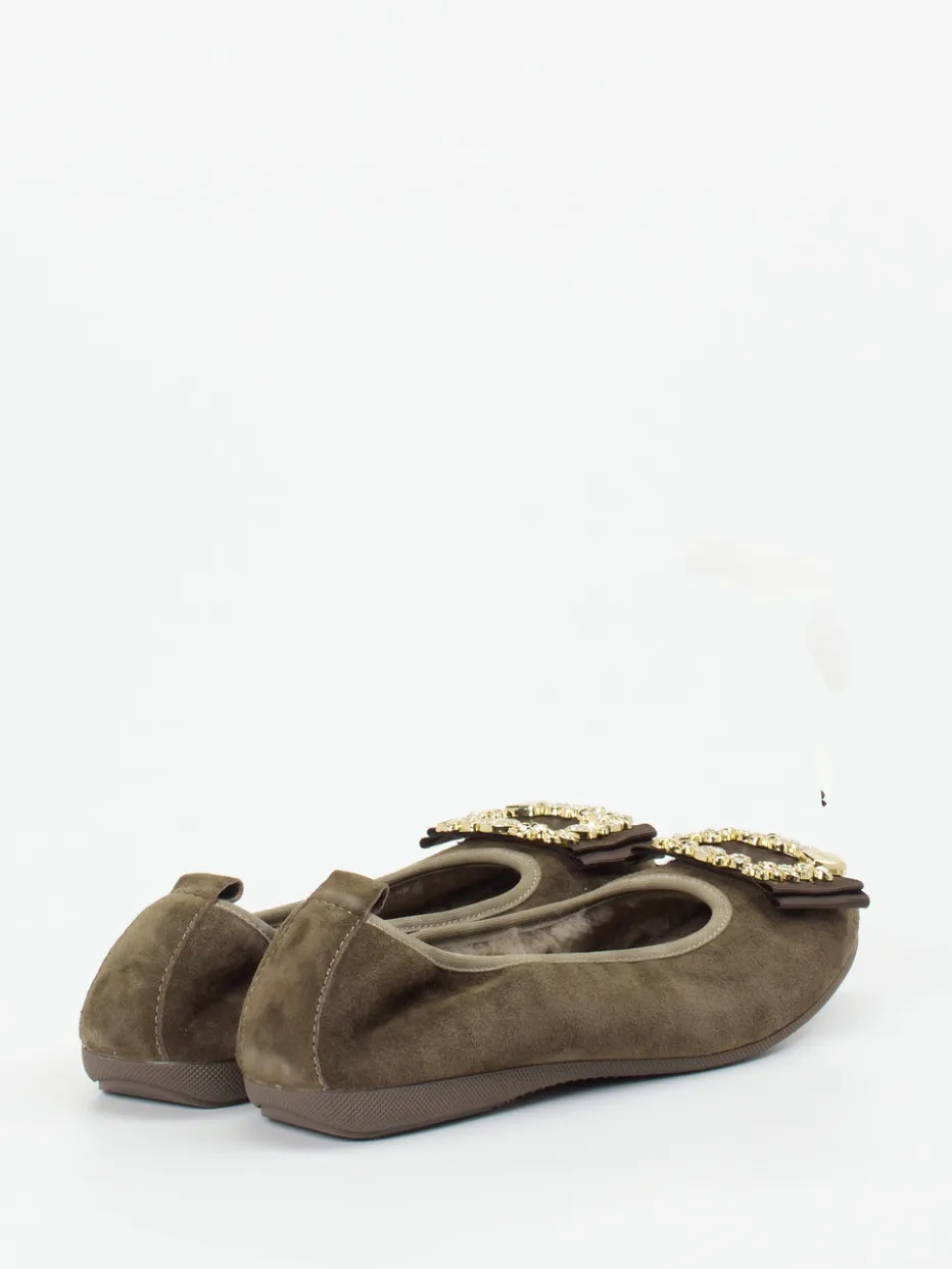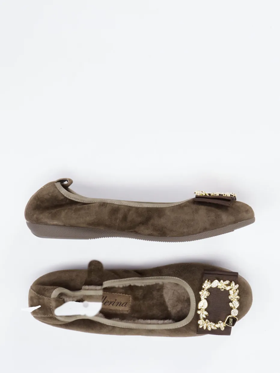 Wärmender Chic mit femininer Raffinesse.La Ballerina interpretiert klassische Damen-Ballerinas saisonal neu. Dieses Modell bietet komfortable Eleganz für kühlere Tage. Das feinsamtige Veloursleder zeigt sich in edlem Olivbraun mit matter Oberfläche und präzisem Finish. Im Inneren sorgt echtes Lammfell für wohlige Wärme – perfekt für Freizeit wie festliche Gelegenheiten. Die runde Form, das elastische Ripsband und die flexible Gummisohle garantieren optimalen Sitz und Tragekomfort. Besonderes Highlight: eine austauschbare Schmuckspange in floraler Goldoptik mit Strass-Besatz. Die Retro-Feminin-Ästhetik mit „Quiet Luxury“-Appeal passt zu Strick und Wildledertaschen. Ein stilvolles Statement für kalte Tage mit signifikantem Tragekomfort.