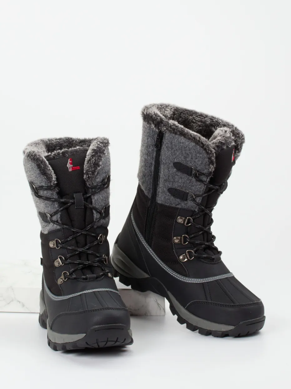 Ideal für frostige Ausflüge und winterliche Alltagssituationen schützt das wind- und wasserdichte Synthetikmaterial, unterstützt durch eine atmungsaktive L-Tex Membran, zuverlässig vor Nässe. Der schwarze Schuh mit matter Oberfläche, reflektierenden Nähten und Metallösen wirkt markant und funktional zugleich. Kunstfellfutter sichert angenehme Wärme, während ein praktisches Duo aus Reißverschluss und Schnürung ein leichtes Anziehen ermöglicht. Die profilierte Gummisohle liefert stabilen Halt auf rutschigem Untergrund – perfekt für die Trends GORPcore und Winter Layering.