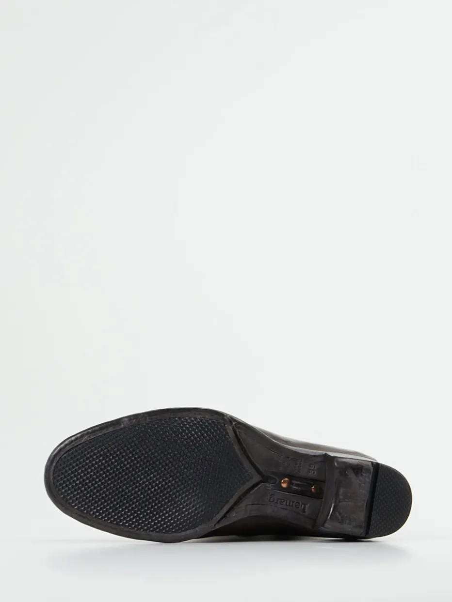 Diese edlen Damen-Stiefeletten vereinen glänzendes Büffelleder mit Vintage-Finish und moderner Silhouette – ein stiller Luxusklassiker mit cleanem Reißverschluss-Detail.