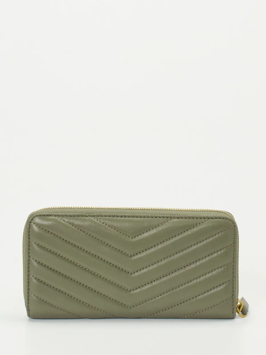 Fein genarbtes Lammleder trifft auf geometrische Steppung in modernem Olivgrün – eine Kombination aus Funktionalität und zeitloser Ästhetik.