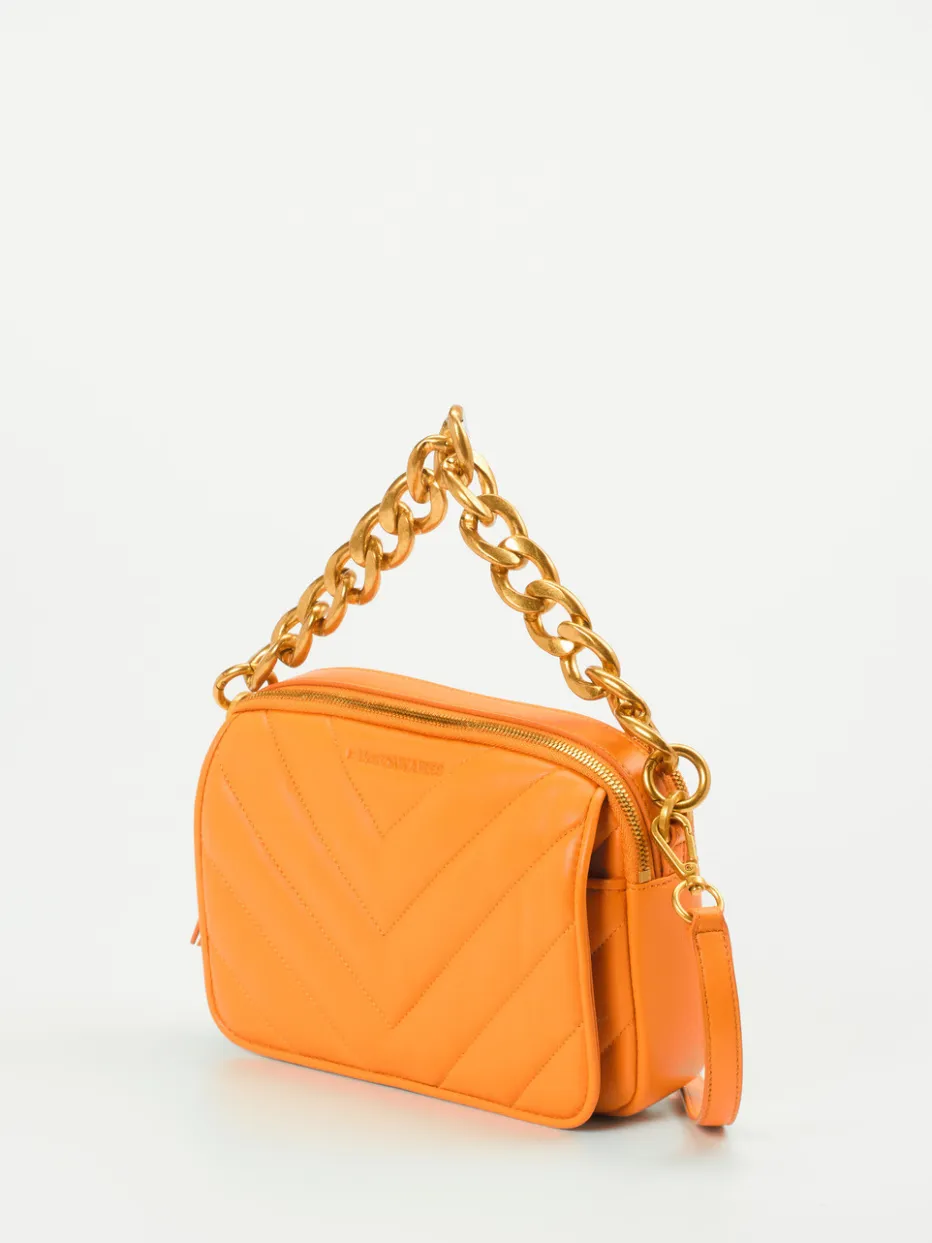Leuchtendes Orange und goldene Details machen diese Crossbody Bag zum Statement-Piece. Hochwertiges Lammleder, praktische Fächeranordnung und zwei Tragevarianten runden das Design stilvoll ab.
