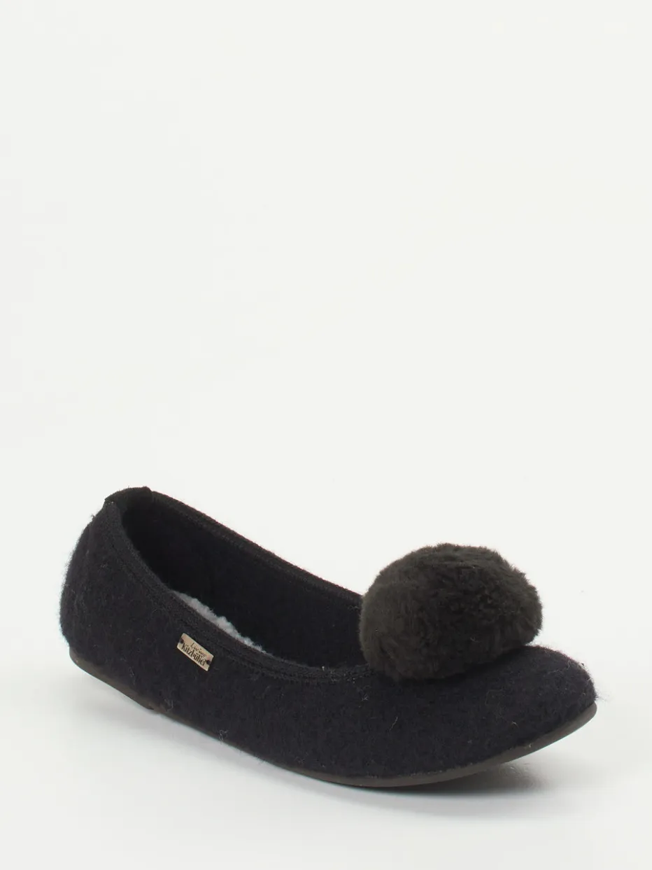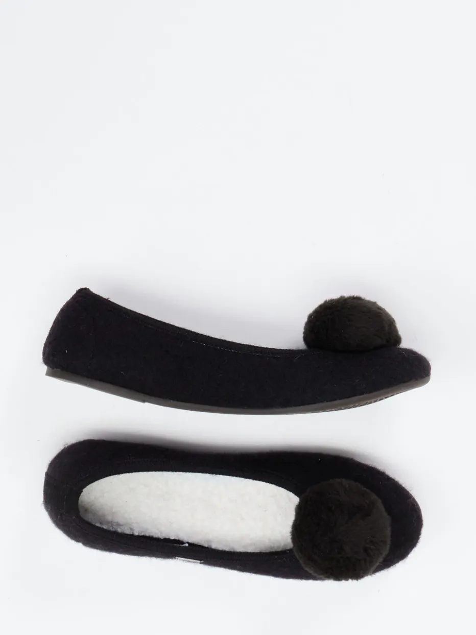 Verspielter Komfort für entspannte Tage.Living Kitzbühel präsentiert klassische Ballerina-Hausschuhe in eleganter schwarzer Ausführung. Für warme Füße an kalten Tagen sorgt das handverarbeitete Obermaterial aus Wolle mit filziger Textur und kuscheligem Kunstfellfutter. Die rund geschlossene Silhouette in Schlupfform wird von dekorativen, tonigen Pompons und einem seitlichen Metall-Label charmant begleitet. Eine leicht profilierte Gummisohle bietet rutschhemmende Stabilität beim Gehen auf glatten Böden. Stilistisch passen sie perfekt zum Cozy Comfort-Trend und lassen sich ideal mit flauschigen Hausanzügen kombinieren. Ein Qualitätsprodukt für stilvolle Entspannung mit alpinem Flair.