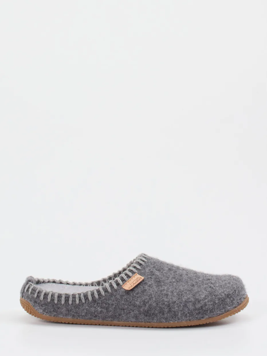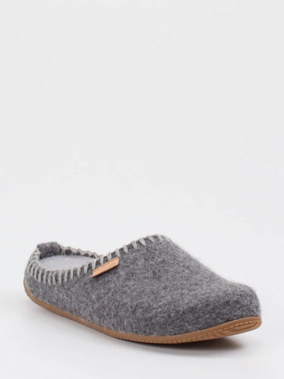 Die rundum geschlossenen Pantoffeln überzeugen mit hochwertigem Wollfilz, klarer Linienführung und rutschfester Gummisohle – für stilvollen Komfort zu Hause.