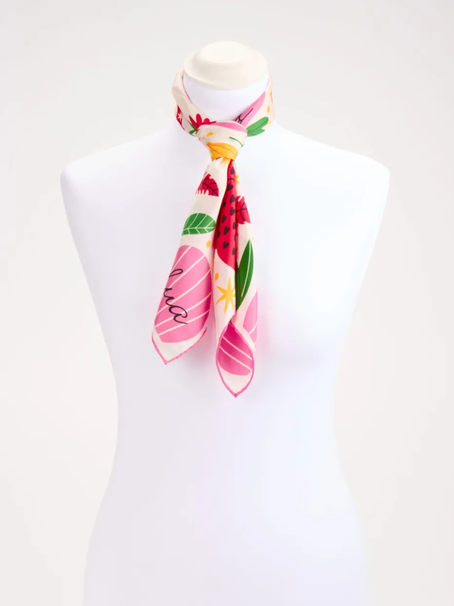 Feinste Seide trifft auf sommerliche Farbenfreude: Dieses schmale Tuch belebt jedes Outfit mit illustrativem Retro-Charme und glänzender Leichtigkeit.