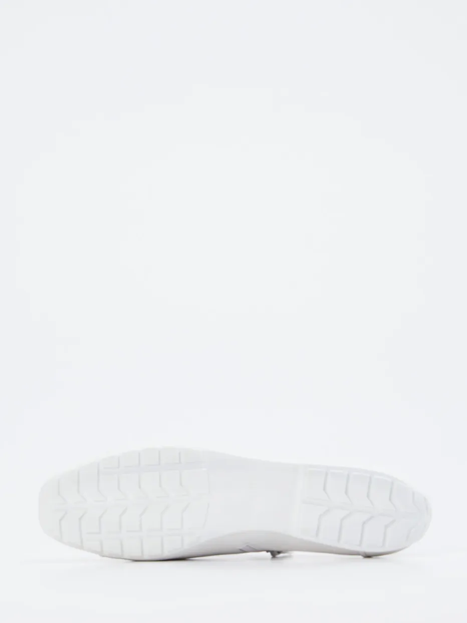 Das weiße, genarbte Lammleder verleiht dem Sneaker eine geschmeidige Haptik mit dezentem Glanz, während silberfarbene Ösen mit funkelnden Swarovski Kristallen edle Akzente setzen. Die flache, runde Form und eine flexible Gummisohle mit hochgezogener Ferse sorgen für Komfort bei täglichen Erledigungen oder entspanntem Flanieren. Schnürung und seitlicher Reißverschluss erleichtern das An- und Ausziehen. Inspiriert vom Trend „Quiet Luxury“ fügt sich das Modell harmonisch in minimalistische Looks.