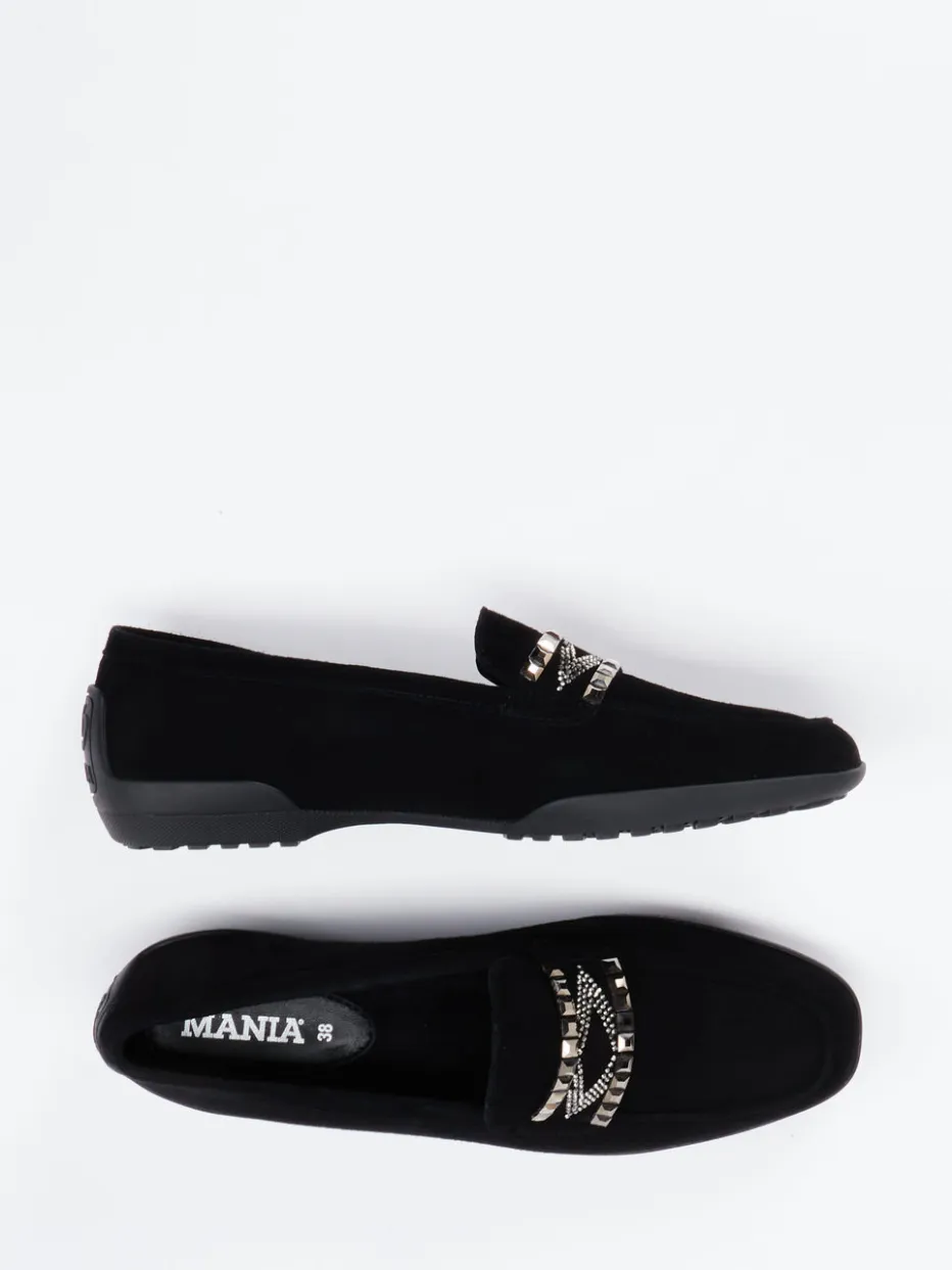 Eleganz mit urbanem Anspruch.Die italienische Marke Mania präsentiert einen Damen-Loafer, der Komfort und Stil harmonisch vereint. Ideal für bewegte Tage zwischen Büro und Stadtbummel: Das schwarze Veloursleder wirkt durch die samtige Oberfläche besonders edel. Der flach geschnittene Slipper zeigt eine klassische Linie, die durch eine markante Mokassinnaht sportiv betont wird. Blickfang ist die glänzende Metallapplikation auf dem Spann, die mit subtiler Nietenoptik aktuelle „Quiet Luxury“-Trends interpretiert. Die profilierte Gummisohle garantiert Rutschfestigkeit, während das weiche Lammnappafutter und die gepolsterte Lederinnensohle hohen Tragekomfort sichern. Kombinierbar zu schmalen Hosen oder eleganten Röcken. Authentischer Chic in hochwertiger Verarbeitung – typisch Mania.