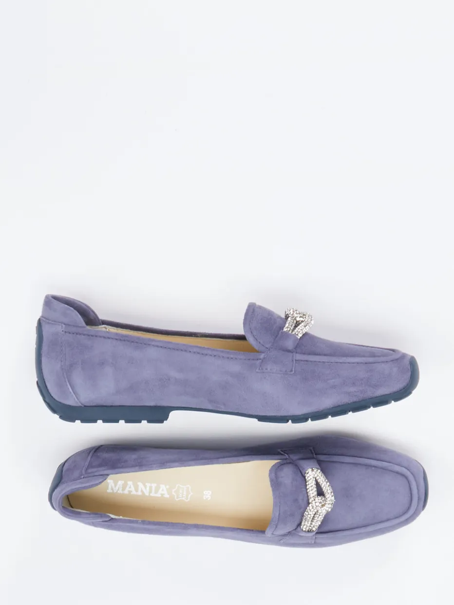 Eleganz im Alltag neu gedacht.Der Damen-Loafer von Mania überzeugt durch seine raffinierte Gestaltung in modischem Lavendelblau. Ideal für Büro und Freizeit, kombiniert dieser Slipper samtig angeschliffenes Veloursleder mit einer flexiblen, dunkelblauen Gummisohle. Die klare, klassische Silhouette wird durch eine Strassbesetzte Schmuckspange auf dem Spann elegant akzentuiert. Dank der flachen Form, der profilierten Sohle und einem komfortablen Fersenbereich bewährt sich das Modell auch bei längerem Tragen. Minimalistische Anleihen und der Pastellton unterstreichen aktuelle Stiltrends. Harmoniert mit fließenden Stoffhosen oder farblich abgestimmten Cardigans. Dezente Raffinesse mit hoher Alltagstauglichkeit – typisch Mania.