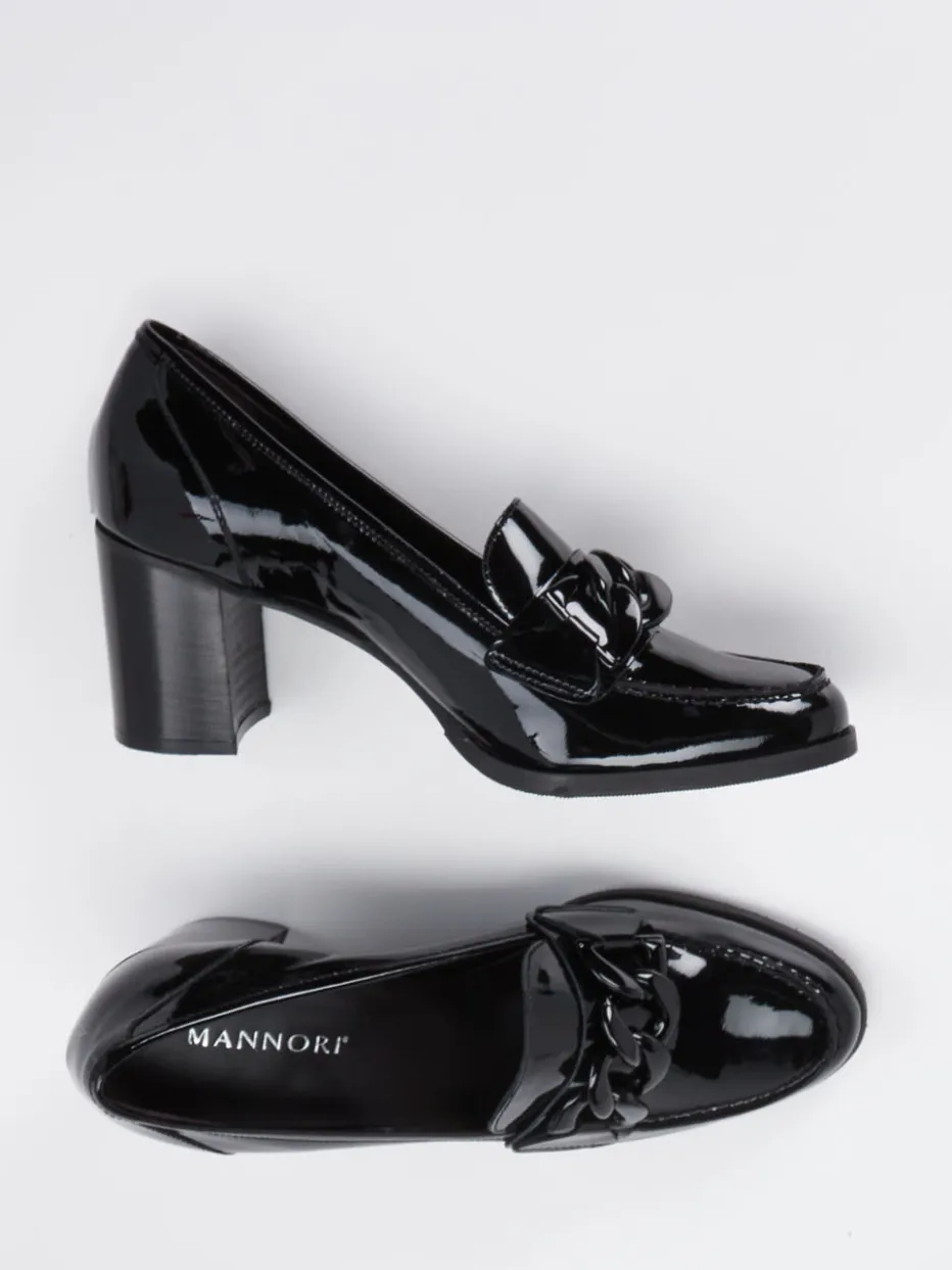 Glanzvolles Statement für stilbewusste Looks.Mannori interpretiert den klassischen Damen-Loafer als hochwertigen Blockabsatz-Pumps aus schwarzem Lackleder. Ideal für lange Büro- oder Eventtage sorgt das gepolsterte Lederfußbett gemeinsam mit der flexiblen Gummisohle für angenehmen Komfort. Das glatte, hochglänzende Lackleder kommt in Uni-Schwarz und wird durch eine breite, tonale Kettenapplikation akzentuiert. Der 6 cm hohe Holzblockabsatz und die leicht eckige Zehenlinie verleihen dem Design Vintage-Charme mit modernem Twist – inspiriert vom Quiet-Luxury-Trend. Perfekter Stilpartner für Businesshosen oder fließende Midikleider. Ein charakterstarkes Modell mit klarer Formsprache und edler Materialästhetik.