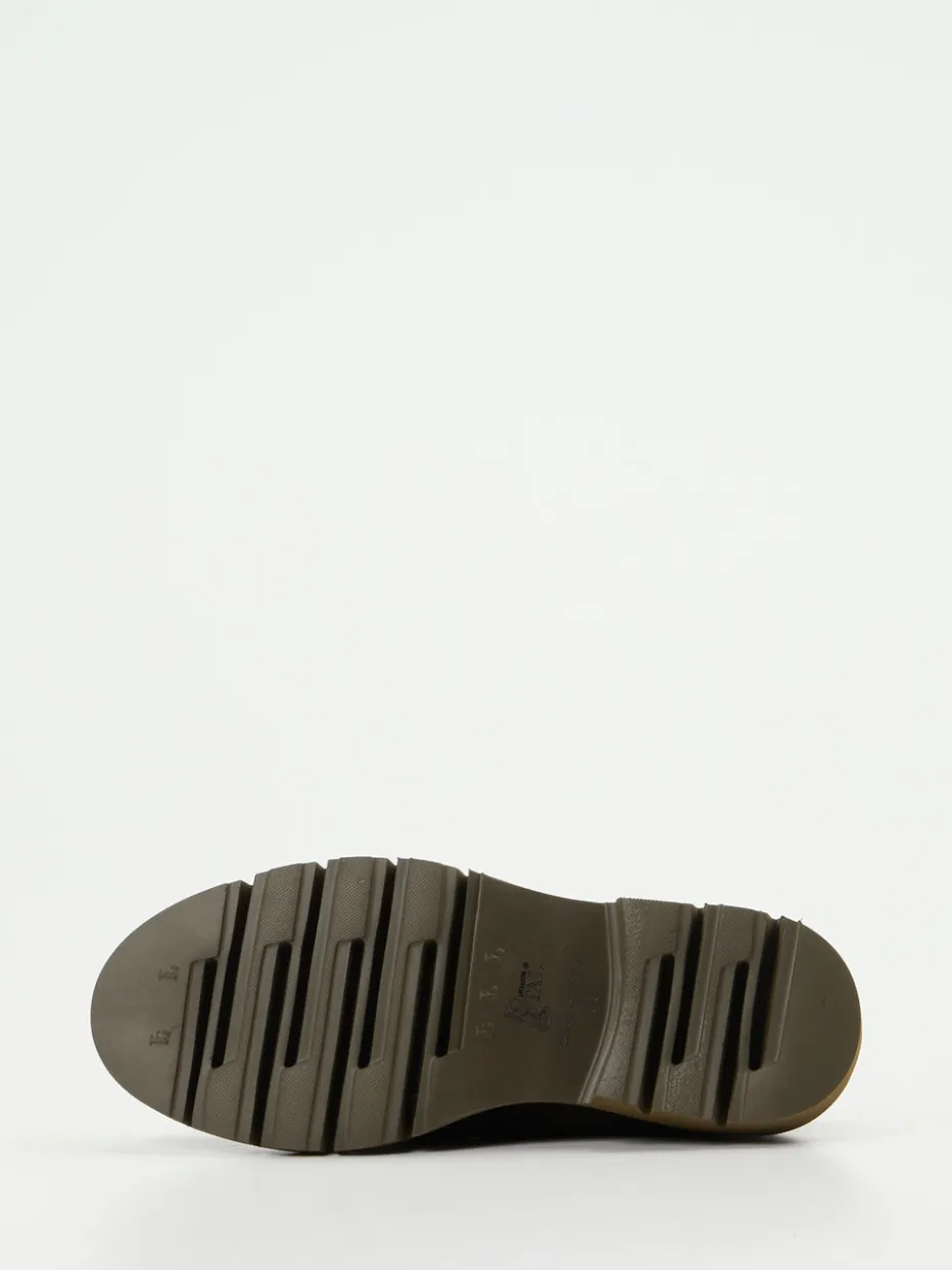 Flaschengrüner Statement-Loafer für City-Looks.Mannori interpretiert die klassische Slipperform neu und verleiht dem Damen-Loafer stilvolle Präsenz. Für den modernen Alltag entwickelt, zeigt das Modell flaschengrünes Veloursleder mit samtig-matter Oberfläche und tonaler Mokassinnaht. Die breite Silhouette mit profilierter, hoher Leichtzellsohle wirkt betont urban. Highlight ist die großgliedrige Gliederkette in Bronzeton auf der offenen Bride – ein Eyecatcher mit modischer Ausstrahlung. Innen sorgt Ziegenleder mit gepolstertem Fußbett für Tragekomfort. Ein idealer Begleiter für Business und Freizeit, besonders zu Oversized-Blazern und Lederaccessoires in Cognac. Stilvoller Chic und Komfort – mit markanter Zierkette als modisches Statement.
